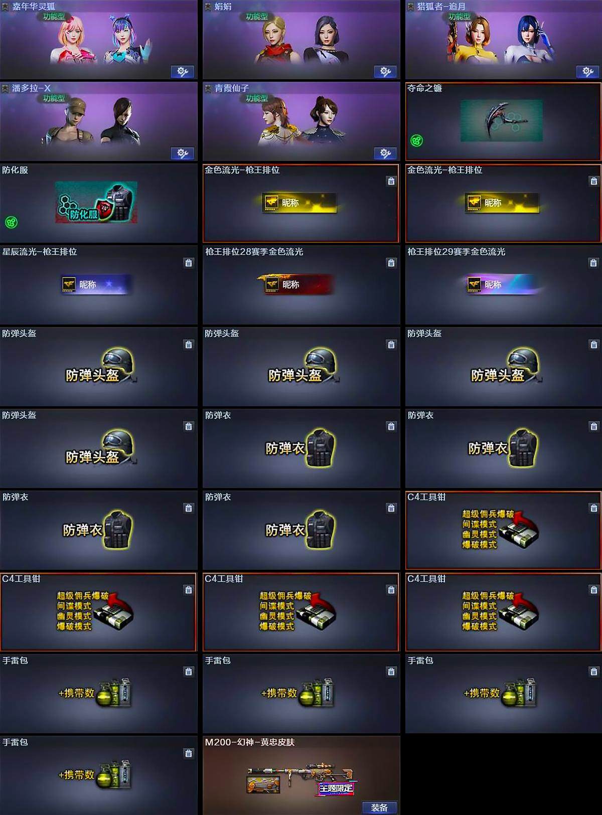 【道具】:夺命之镰,防化服,金色流光-枪王排位*2,星辰流光-枪王排位,枪王排位28赛季金色流光,枪王排位29赛季金色流光,防弹头盔*4,防弹衣*4,C4工具钳*4,手雷包*4