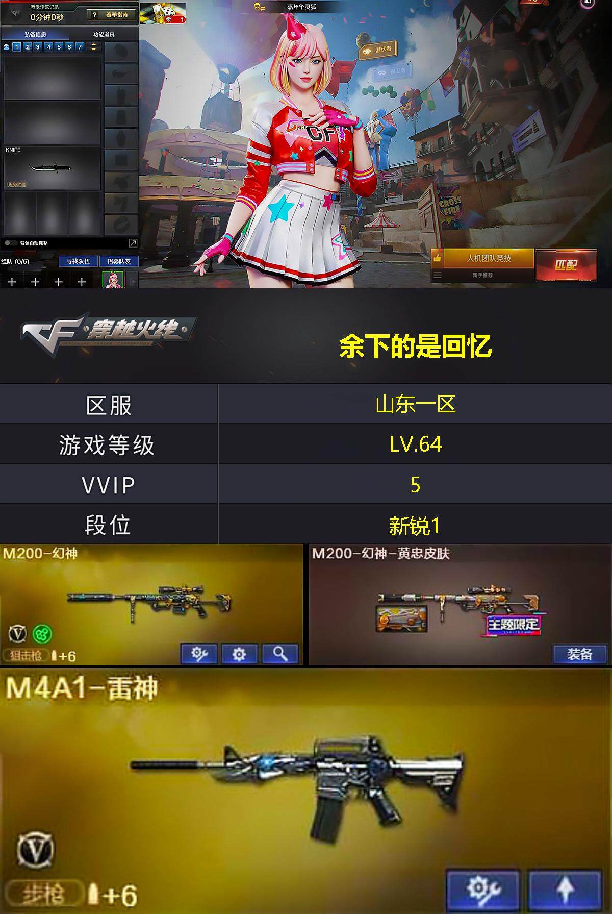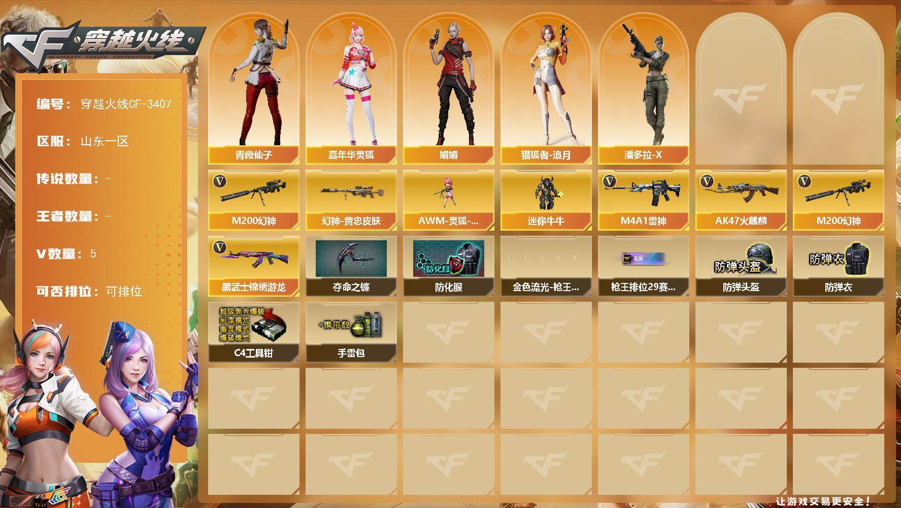 [13631630]山东一区-5V-0王者-0炫金 【热门武器】:M200-幻神 【皮肤】:M200-幻神-黄忠皮肤 【角色】:嘉年华灵狐,娟娟,猎狐者-追月,潘多拉-X,青霞仙子 【人偶武器】:AWM-灵狐-15周年嘉年华,迷你牛牛 【英雄级武器】:AK47-火麒麟,M4A1-雷神,黑武士-锦绣游龙,M200-幻神 【道具】:夺命之镰,防化服,金色流光-枪王排位*2,星辰流光-枪王排位,枪王排位28赛季金色流光,枪王排位29赛季金色流光,防弹头盔*4,防弹衣*4,C4工具钳*4,手雷包*4 【特殊枪械】: