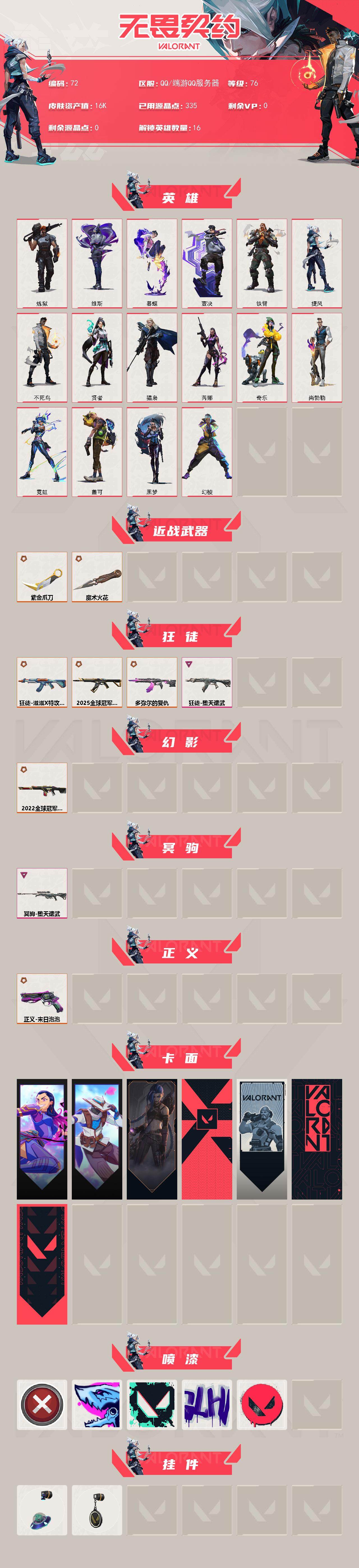 [13658380]【英雄】:幻棱,炼狱,维斯,暮蝶,壹决,铁臂,捷风,不死鸟,贤者,猎枭,芮娜,奇乐,尚勃勒,霓虹,盖可,黑梦 【近战 武器】:近战武器-魔术火花,近战武器-紫金爪刀,近战武器-魔术火花 【狂徒】:狂徒-2025全球冠军赛,狂徒-滋滋X特攻队,狂徒-多弥尔的复仇,狂徒-堕天遗武 【幻影】:幻影-2022全球冠军赛 【冥驹】:冥驹-堕天遗武 【正义】:正义-末日泡泡 【卡面】:无畏契约GO!第一卷:芮娜 卡面,无畏契约GO!第一卷:零 卡面,《双城之战》金克丝 卡面,代号红色 卡面,新兵报到 卡面,V契约 卡面,无畏契约 卡面 【喷漆】:买装还是存钱 喷漆,暴走萝莉 喷漆,胜利属于无畏契约 喷漆,GLHF 喷漆,无畏契约 喷漆 【挂饰】:天外飞客 挂饰,无畏契约 纪念币 挂饰