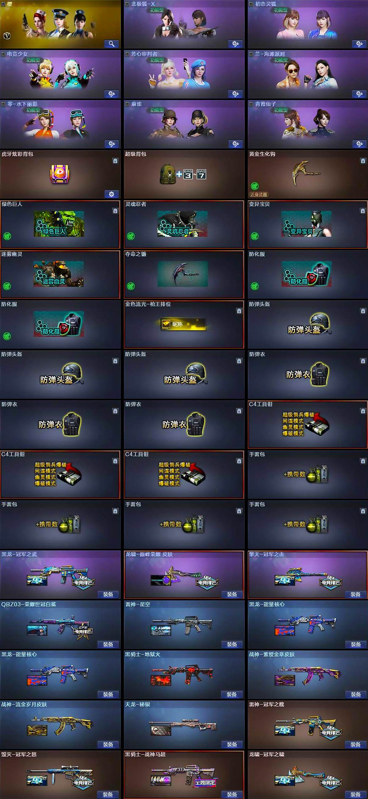 【皮肤】:QBZ03-荣耀世冠白鲨,雷神-星空,雷神-冠军之魄,毁灭-冠军之怒,黑龙-能量核心*2,黑龙-冠军之武,黑骑士-地狱火,黑骑士-战神马超,战神-紫绶金章皮肤,战神-流金岁月皮肤,天龙-秘银,龙啸-冠军之啸,龙啸-巅峰荣耀 皮肤,擎天-冠军之击