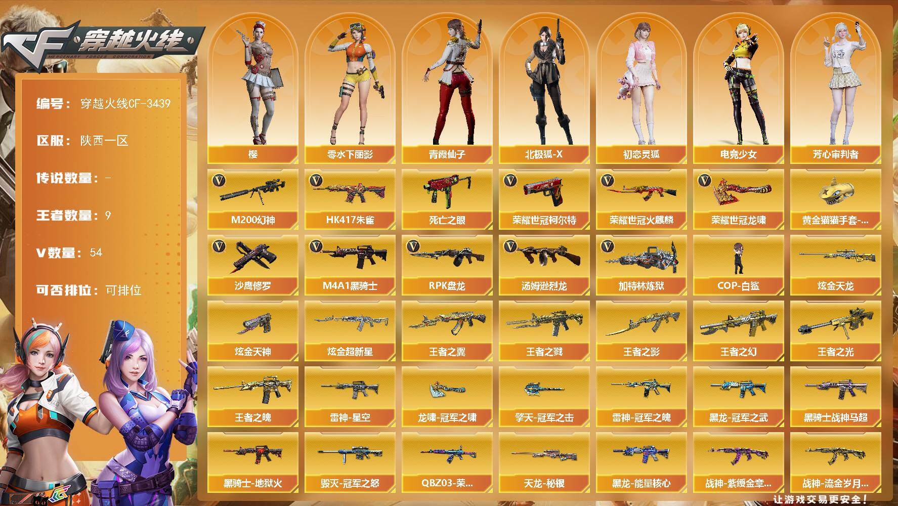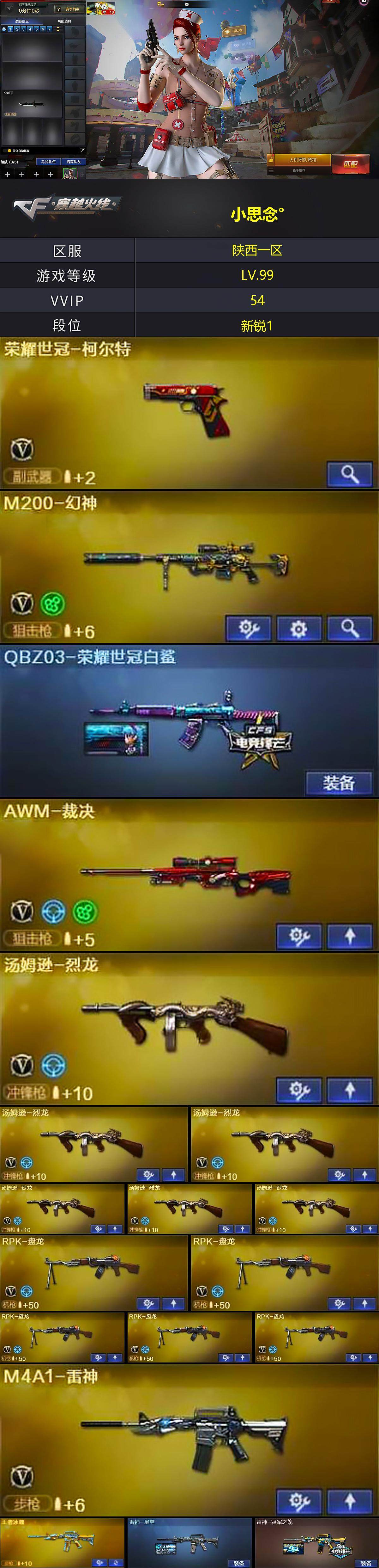 [13658560]陕西一区-54V-9王者-8炫金 【热门武器】:HK417-朱雀,M200-幻神,死亡之眼,荣耀世冠-火麒麟,荣耀世冠-柯尔特,M4A1-黑骑士,汤姆逊-烈龙*6,RPK-盘龙*5,加特林-炼狱*3,COP-白鲨,沙鹰-修罗*5,荣耀世冠-龙啸,黄金猫猫手套-白鲨 【王者炫金武器】:王者之戮,王者之幻,王者之翼,王者之影,王者之魄,王者之光,炫金超新星*5,炫金天龙*2,炫金天神 【皮肤】:QBZ03-荣耀世冠白鲨,雷神-星空,雷神-冠军之魄,毁灭-冠军之怒,黑龙-能量核心*2,黑龙-冠军之武,黑骑士-地狱火,黑骑士-战神马超,战神-紫绶金章皮肤,战神-流金岁月皮肤,天龙-秘银,龙啸-冠军之啸,龙啸-巅峰荣耀 皮肤,擎天-冠军之击 【角色】:樱,北极狐-X,初恋灵狐,电竞少女,芳心审判者,兰-海滩派对,零-水下丽影,麻雀,青霞仙子 【人偶武器】:COP-白鲨,M4A1-雷神-精英刀锋,迷你钢铁终结者,迷你救赎猎手,迷你生化手雷*2 【暴走生化】:死亡之眼 【英雄级武器】:AK47-火麒麟*3,M4A1-黑龙,M4A1-雷神,M4A1-黑骑士,AK47-机械迷城,AK47-黑鲨,M4A1-龙血,HK417-朱雀,M4A1-猎神*3,王者之武-觉醒版,AK-47-猩红传说*3,黑骑士-海王,荣耀世冠-火麒麟,AWM-天龙,Barrett-毁灭*4,AWM-裁决,M200-幻神,王者之力-觉醒版,RPK-盘龙*5,加特林-炼狱*3,汤姆逊-烈龙*6,沙鹰-修罗*5,沙鹰-天神,荣耀世冠-柯尔特,屠龙,龙啸,擎天,麒麟刺*2,荣耀世冠-龙啸,王者之啸-觉醒版 【道具】:虎牙炫彩背包,超级背包,黄金生化钩,绿色巨人,灵魂忍者,变异宝贝,迷雾幽灵,夺命之镰,防化服*2,金色流光-枪王排位,防弹头盔*3,防弹衣*3,C4工具钳*3,手雷包*4 【特殊枪械】:1黑骑士,6烈龙,5盘龙,3炼狱