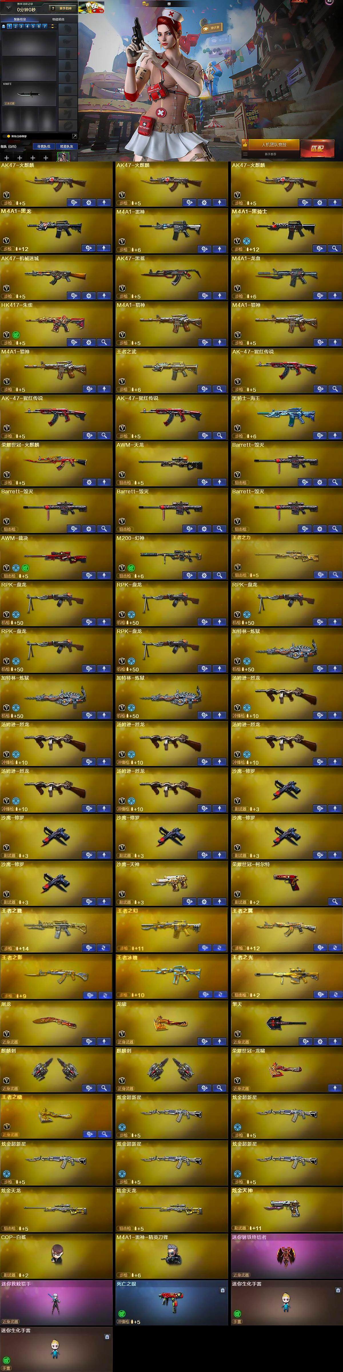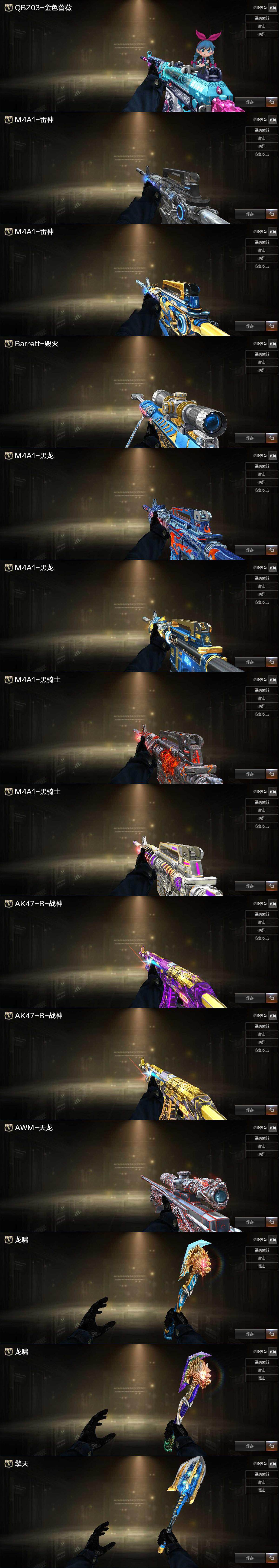 【英雄级武器】:AK47-火麒麟*3,M4A1-黑龙,M4A1-雷神,M4A1-黑骑士,AK47-机械迷城,AK47-黑鲨,M4A1-龙血,HK417-朱雀,M4A1-猎神*3,王者之武-觉醒版,AK-47-猩红传说*3,黑骑士-海王,荣耀世冠-火麒麟,AWM-天龙,Barrett-毁灭*4,AWM-裁决,M200-幻神,王者之力-觉醒版,RPK-盘龙*5,加特林-炼狱*3,汤姆逊-烈龙*6,沙鹰-修罗*5,沙鹰-天神,荣耀世冠-柯尔特,屠龙,龙啸,擎天,麒麟刺*2,荣耀世冠-龙啸,王者之啸-觉醒版