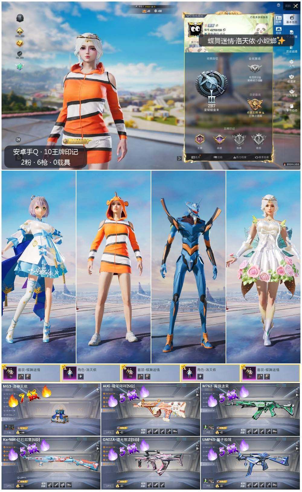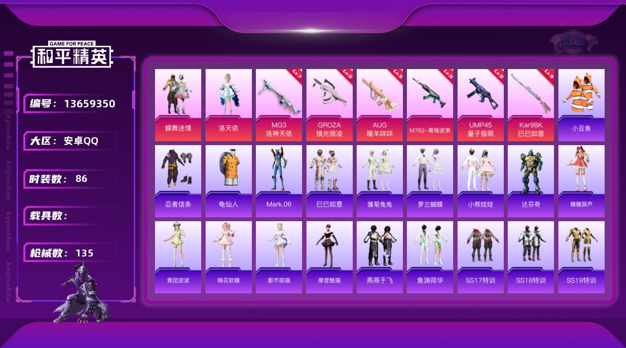 [13659350]【店主推荐捡漏号!可直接换绑】/地铁满天赋 安卓 手Q-2粉装-6特效枪-1粉色飞行器-4.1w热力值-10王牌印记-86套装-135枪皮【热门品类】:套装-小丑鱼,套装-忍者信条,套装-龟仙人,角色-Mark.06【粉色套装】:粉装-蝶舞迷情,角色-洛天依【粉色枪皮等级】:GROZA-镜光银凌(五级),AUG-暖羊咩咩(五级),M762-青锋波束(五级),UMP45-量子极限(五级),Kar98K-巳巳如意(五级),MG3-洛神天依(七级)【粉色飞行器】:冠军兔兔飞行器