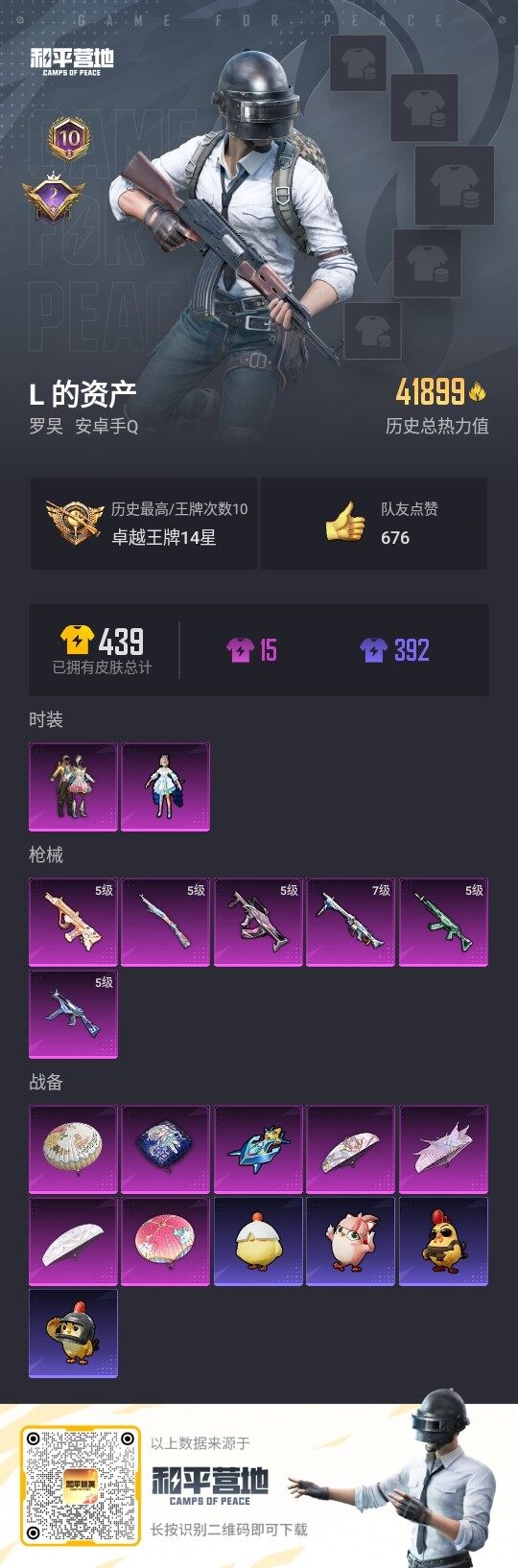 - PX_2102080- 苹果手Q-20王牌印记-13粉装-5特效枪-2载具-113964热力值-292套装-335枪皮-0卓越印记-0传奇印记 【13粉装】,梦幻火箭,甜心巧克力,宝贝奶油派,天使彩虹糖,放客神游,暗夜玫瑰,闲梦青缨,复仇流浪者,月影灵韵,天启纪元,极限特训,快乐主宰,粉色回忆 【5特效枪】AKM-绿萝繁花-5级 SCAR-L-青春物语-7级 M416-五爪金龙-7级 AUG-超新