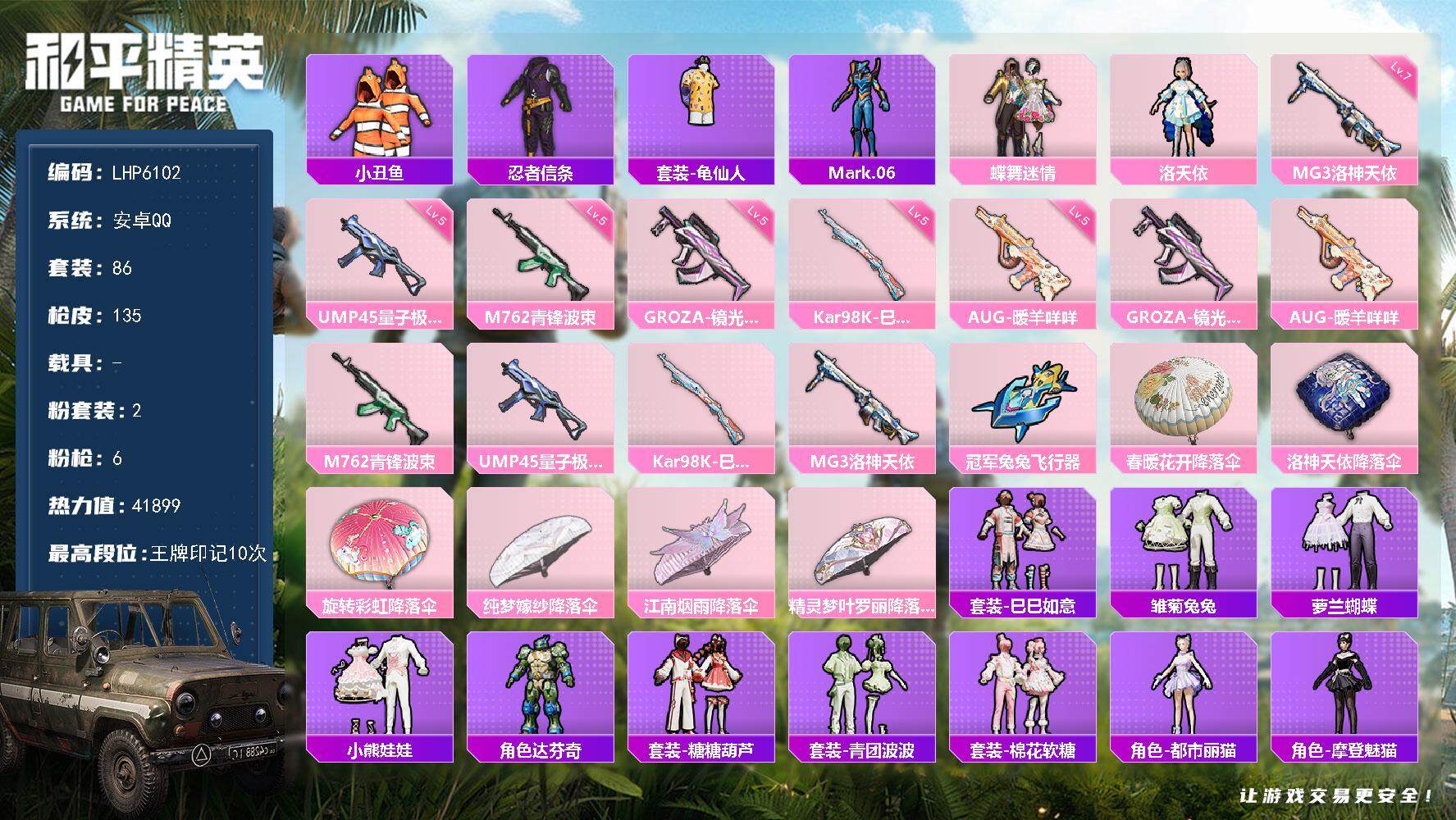 - [13577663]【店主推荐捡漏号!可直接换绑】安卓 手Q-1神装-15粉装-7特效枪-3载具-8粉色飞行器-104810热力值-20王牌印记-226套装-296枪皮【红色神装等级】:魔童闹海-哪吒(三级)【红色角色神装】:魔童闹海-哪吒【热门品类】:粉装-怪诞乔克,粉装-梦幻火箭,套装-浪漫天命,套装-都市猎人,套装-深海小丑鱼,套装-小丑鱼,套装-奇异狩猎者,套装-龟仙人,套装-暗影哥特,角色-Mark.06,小丑红鼻头,熔岩游骑兵面罩,撬棍-龙胆亮银枪,熔岩游骑兵连帽夹克【粉色载具】:宾利飞驰(布罗德盖棕双色),踏焰逐风摩托车,鬼马风驰【粉色套装】:粉装-未来战士,粉装-怪诞乔克,粉装-宝贝奶油派,粉装-梦幻火箭,粉装-冰霜白皇,粉装-彩虹鹿灵,粉装-金风银杏,粉装-炙焰牛王,粉装-暗夜鎏金,角色-呆萌星弥,角色-圣堂之誓,角色-小叽联名款,角色-脉冲星,粉装-桃粉嫣然,角色-羊梦糖心【粉色枪皮等级】:AKM-星际浪客(七级),AKM-绿萝繁花(五级),SCAR-L-魔童闹海 哪吒(三级),M416-五爪金龙(七级),M762-激战未来(七级),Kar98K-巳巳如意(五级),DP-28-豹影疾电(二级)【粉色枪皮】:AKM-星际浪客,AKM-绿萝繁花,SCAR-L-魔童闹海 哪吒,M416-五爪金龙,M762-激战未来,Kar98K-巳巳如意,DP-28-豹影疾电【粉色飞行器】:庄周梦蝶飞行器,冷魅冰骑飞行器,星夜魔法师飞行翼,萌物绒绒飞行器,繁龙极客飞行器,镜域双华-灵镜之阶,飞天猪飞行器