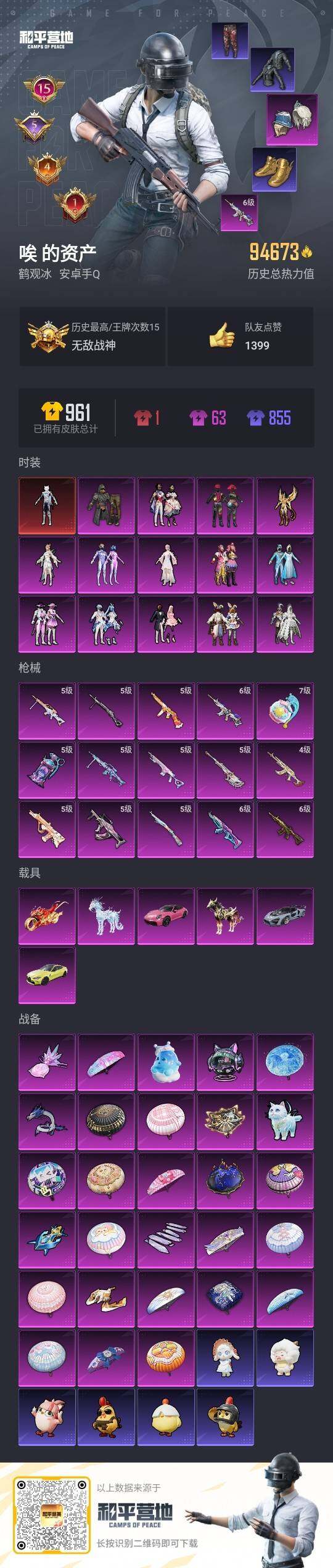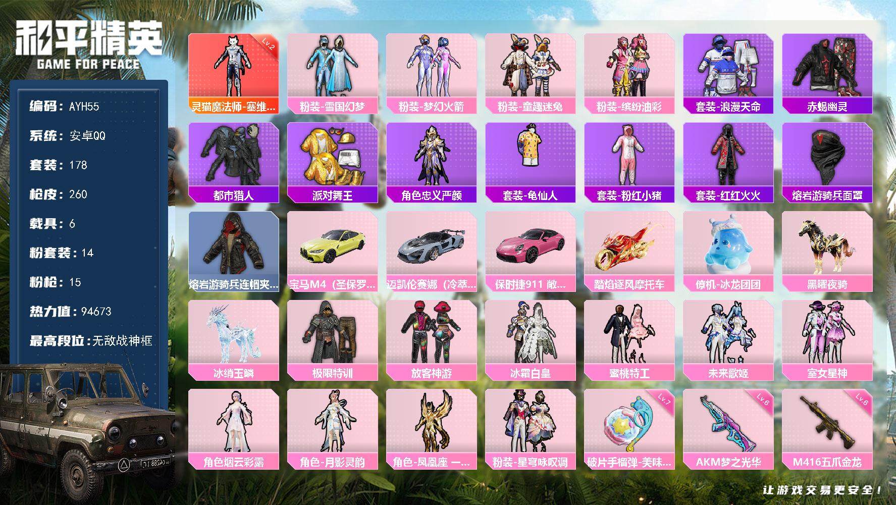 [13712663]【店主推荐捡漏号!可直接换绑】安卓 手Q-无敌战神框-1神装-14粉装-15特效枪-6载具-7粉色飞行器-94673热力值-15王牌印记-178套装-260枪皮【红色神装等级】:灵猫魔法师-塞维尔(二级)【红色角色神装】:灵猫魔法师-塞维尔【热门品类】:粉装-雪国幻梦,粉装-梦幻火箭,粉装-童趣迷兔,粉装-缤纷油彩,套装-浪漫天命,套装-赤蝎幽灵,套装-都市猎人,套装-派对舞王,角色-忠义严颜,套装-龟仙人,套装-粉红小猪,套装-红红火火,熔岩游骑兵面罩,熔岩游骑兵连帽夹克【粉色载具】:宝马M4(圣保罗黄),迈凯伦塞纳(冷萃蓝),保时捷911 敞篷版(星珀红),踏焰逐风摩托车,僚机-冰龙团团,黑曜夜骑,冰绡玉鳞【粉色套装】:粉装-极限特训,粉装-雪国幻梦,粉装-梦幻火箭,粉装-缤纷油彩,粉装-放客神游,粉装-冰霜白皇,粉装-童趣迷兔,粉装-蜜桃特工,粉装-未来歌姬,粉装-室女星神,角色-烟云彩露,角色-月影灵韵,角色-凤凰座 一辉,粉装-星穹咏叹调【粉色枪皮等级】:AKM-梦之光华(六级),M416-五爪金龙(六级),M416-灵猫魔法师(六级),GROZA-镜光银凌(五级),AUG-暖羊咩咩(五级),M762-鬼刀(四级),汤姆逊-热量炸弹(五级),Kar98K-巳巳如意(五级),Mk14-甜梦熊击(五级),AMR-智耀战神(五级),DP-28-豹影疾电(五级),MG-36-幻彩电音(五级),MG-36-沧焰双生(五级),烟雾弹-电雾迷城(五级),破片手榴弹-美味星星糖(七级)【粉色枪皮】:AKM-梦之光华,M416-五爪金龙,M416-灵猫魔法师,GROZA-镜光银凌,AUG-暖羊咩咩,M762-鬼刀,汤姆逊-热量炸弹,Kar98K-巳巳如意,Mk14-甜梦熊击,AMR-智耀战神,DP-28-豹影疾电,MG-36-幻彩电音,MG-36-沧焰双生,烟雾弹-电雾迷城,破片手榴弹-美味星星【粉色飞行器】:拂晓神骑飞行器,镜域双华-灵镜之阶,冠军兔兔飞行器,灵猫魔法师飞行器,灵珠游龙飞行器