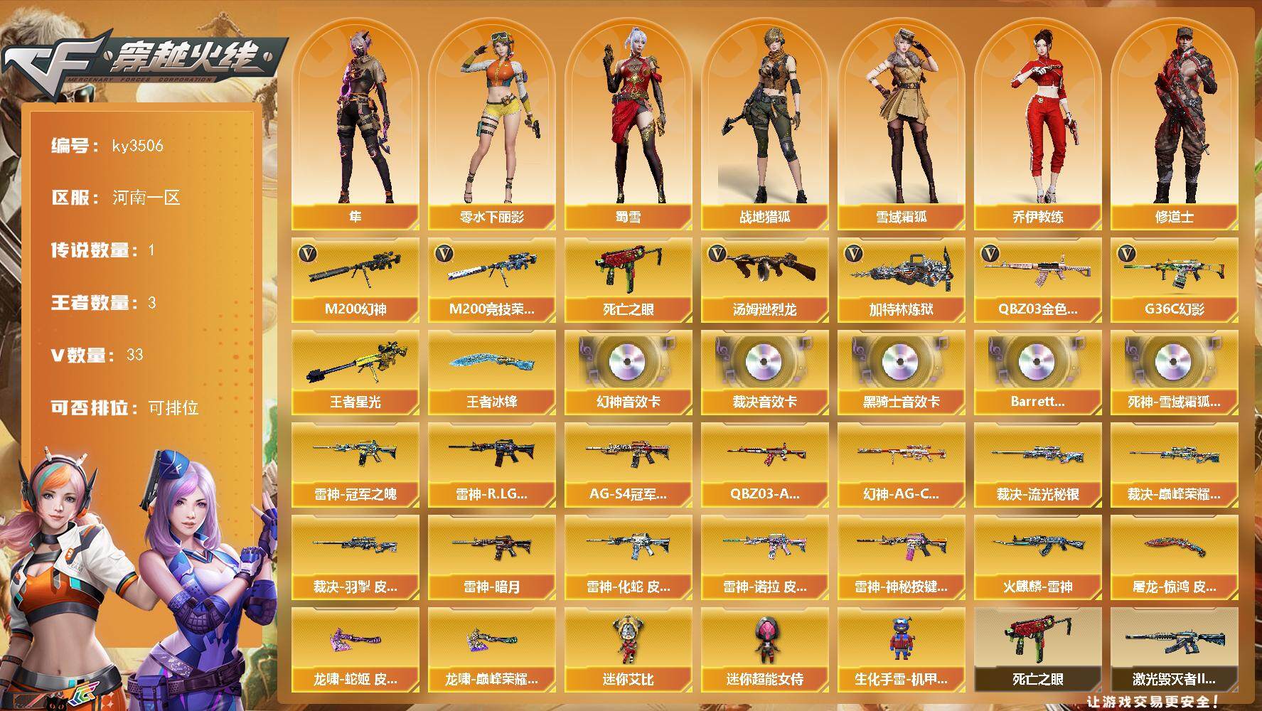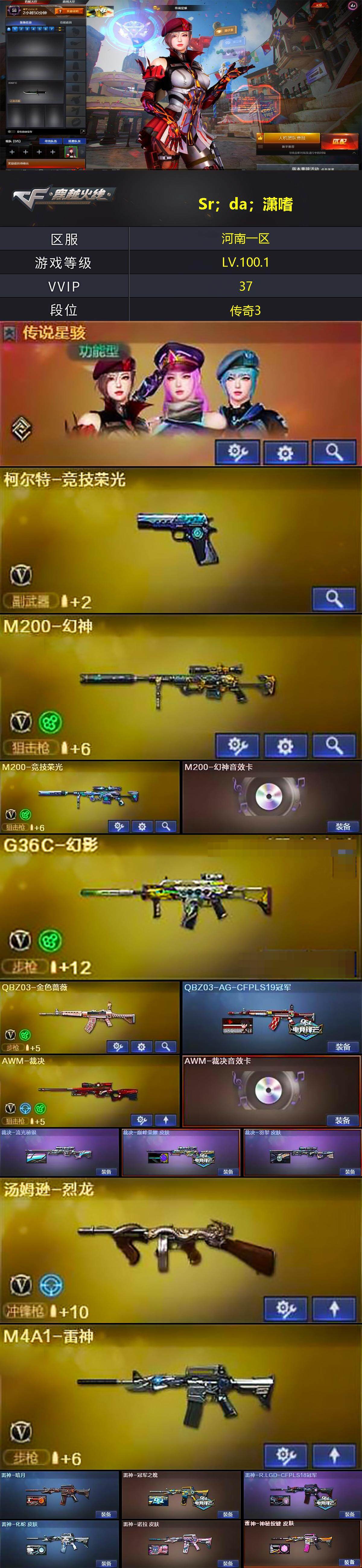 [13720843]河南一区-33V-3王者-0炫金 【传说角色】:传说星骇 【热门武器】:G36C-幻影,QBZ03-金色蔷薇,M200-幻神,M200-竞技荣光,死亡之眼*2,汤姆逊-烈龙,加特林-炼狱*2 【王者炫金武器】:王者星光,王者冰锋 【音效卡】:M200-幻神音效卡,M4A1-黑骑士音效卡,AWM-裁决音效卡,Barrett-碧霄极光音效卡,死神-雪域霜狐-怀旧音效卡 【皮肤】:幻神-AG-CFPL S24冠军 皮肤,QBZ03-AG-CFPLS19冠军,裁决-流光秘银,裁决-巅峰荣耀 皮肤,裁决-羽掣 皮肤,雷神-暗月,雷神-冠军之魄,雷神-R.LGD-CFPLS18冠军,雷神-化蛇 皮肤,雷神-诺拉 皮肤,雷神-神秘按键 皮肤,火麒麟-雷神,黑骑士-AG-S4冠军典藏,屠龙-惊鸿 皮肤,龙啸-蛇姬 皮肤,龙啸-巅峰荣耀 皮肤 【角色】:隼,战地猎狐,雪域霜狐,奇洋探员,乔伊教练,修道士,云海玲珑,空,暗夜-X,初恋灵狐,芳心审判者,风暴女,疾风,娟娟,兰妹妹,零-水下丽影,灵狐-花神,灵狐者-X,灵狐者-七夕宝贝,龙儿,龙儿-小淘气,麻雀,玫瑰花神,潜龙队-X,蛇姬,斯沃特-X,蜀雪,兔囡囡,维纳斯,雪莉杨,影武者-X,智影 【人偶武器】:生化手雷-机甲核心,迷你艾比,迷你超能女侍 【暴走生化】:死亡之眼*2 【挑战大师】:激光毁灭者III-白马银枪 【英雄级武器】:AK47-火麒麟,M4A1-雷神,AK47-黑武士,AK47-黑鲨,G36C-幻影,M4A1-玫瑰精灵,QBZ03-金色蔷薇,黑骑士-海王,AWM-裁决,M200-幻神,M200-竞技荣光,加特林-炼狱*2,汤姆逊-烈龙,柯尔特-竞技荣光,屠龙*3,龙啸,擎天-竞技荣光*2,高爆手雷-竞技荣光*2,闪光弹-竞技荣光*2,烟雾弹-竞技荣光*3,M4A1-赤狱骑士,M4A1-苍鸣雷神,Barrett-碧霄极光 【道具】:BS战队炫彩背包,QQ会员专属背包,云山科技背包,亚洲杯纪念炫彩背包,奇洋探员-海龟背包,女皇终结者-背包,战舰背包,迷你冰龙背包,雪域霜狐炫彩背包,女皇终结者-魔龙之吻,救世主-黑桃战神,黄金生化钩,绿色巨人,灵魂忍者*2,迷雾幽灵*2,生化弹匣,夺命之镰,防化服*3,流光-鎏金之域,流光-再燃火线,枪王排位29赛季金色流光,语音特效-怀旧,雪域霜狐表情,C4-再燃火线,防弹头盔*3,防