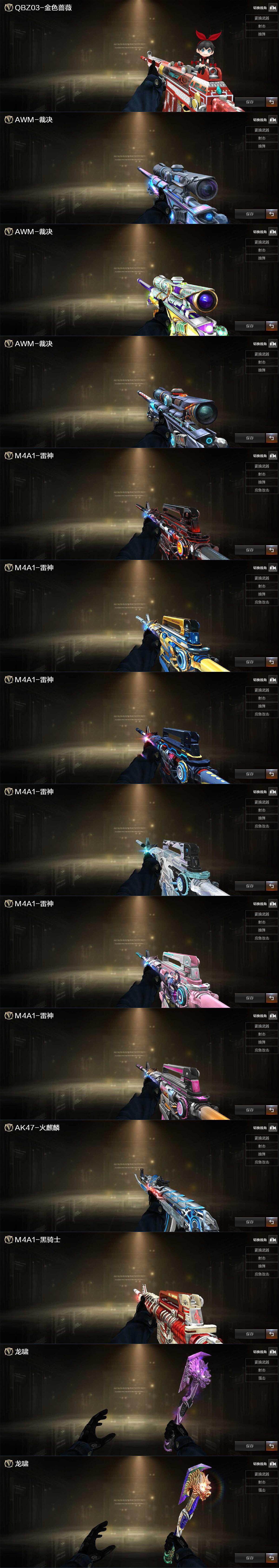 【皮肤】:幻神-AG-CFPL S24冠军 皮肤,QBZ03-AG-CFPLS19冠军,裁决-流光秘银,裁决-巅峰荣耀 皮肤,裁决-羽掣 皮肤,雷神-暗月,雷神-冠军之魄,雷神-R.LGD-CFPLS18冠军,雷神-化蛇 皮肤,雷神-诺拉 皮肤,雷神-神秘按键 皮肤,火麒麟-雷神,黑骑士-AG-S4冠军典藏,屠龙-惊鸿 皮肤,龙啸-蛇姬 皮肤,龙啸-巅峰荣耀 皮肤