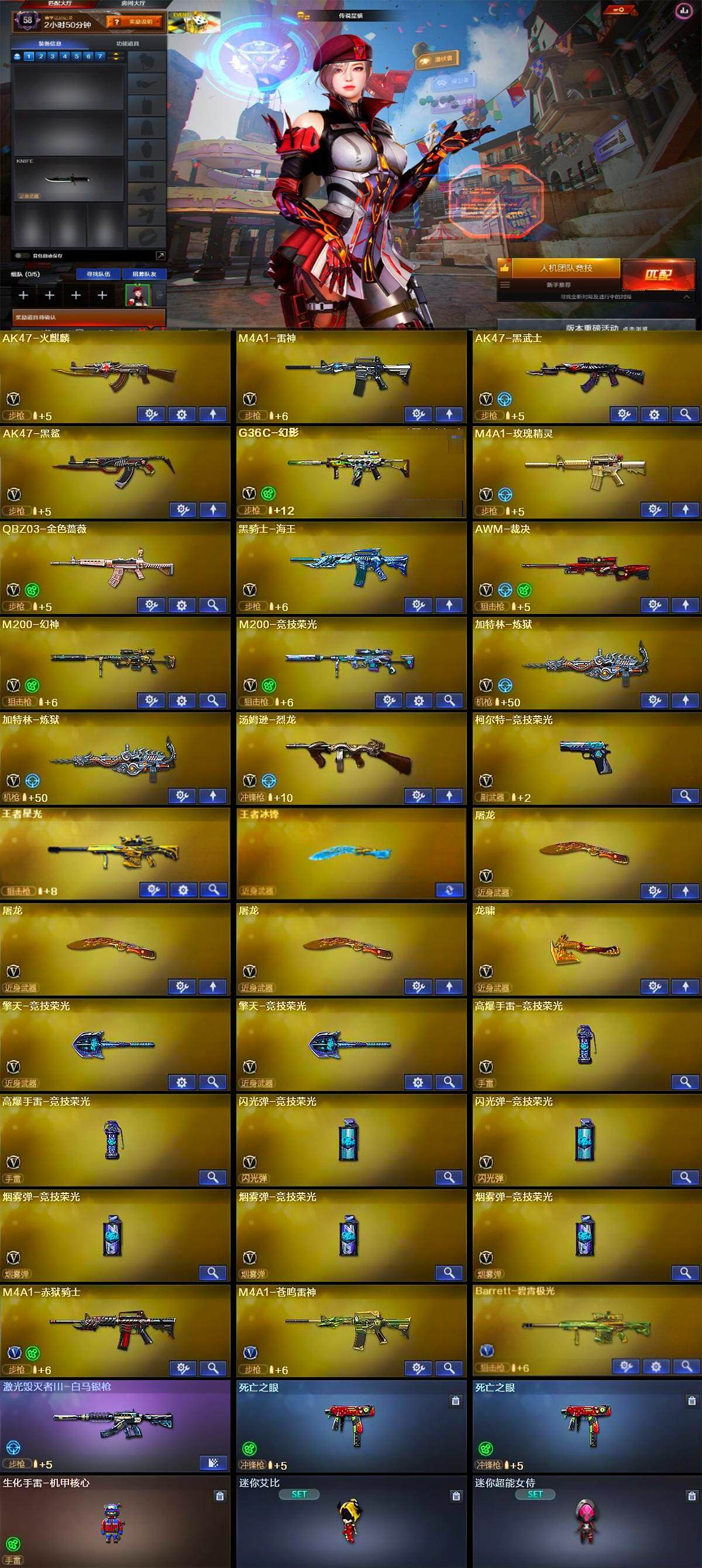 【英雄级武器】:AK47-火麒麟,M4A1-雷神,AK47-黑武士,AK47-黑鲨,G36C-幻影,M4A1-玫瑰精灵,QBZ03-金色蔷薇,黑骑士-海王,AWM-裁决,M200-幻神,M200-竞技荣光,加特林-炼狱*2,汤姆逊-烈龙,柯尔特-竞技荣光,屠龙*3,龙啸,擎天-竞技荣光*2,高爆手雷-竞技荣光*2,闪光弹-竞技荣光*2,烟雾弹-竞技荣光*3,M4A1-赤狱骑士,M4A1-苍鸣雷神,Barrett-碧霄极光