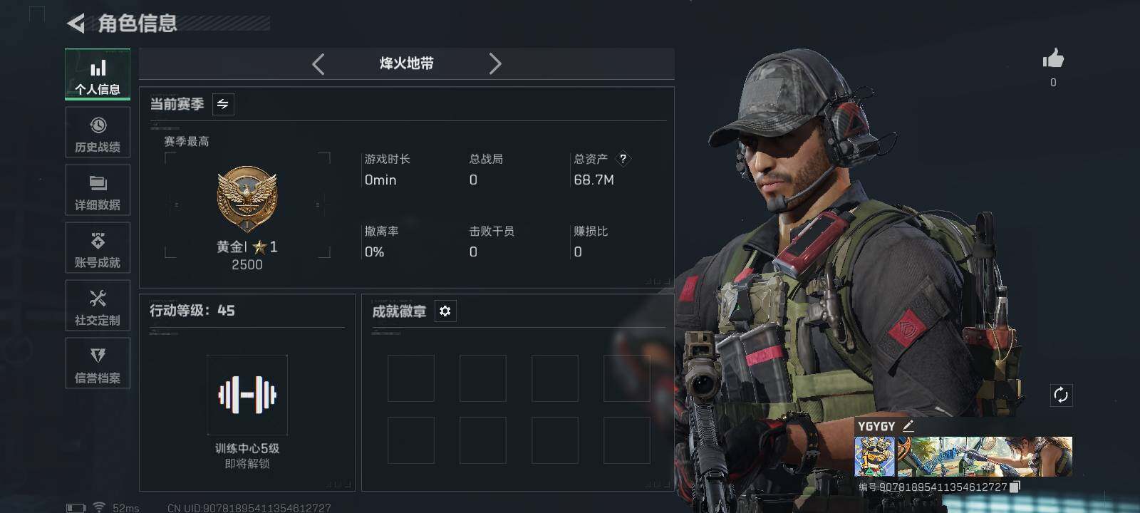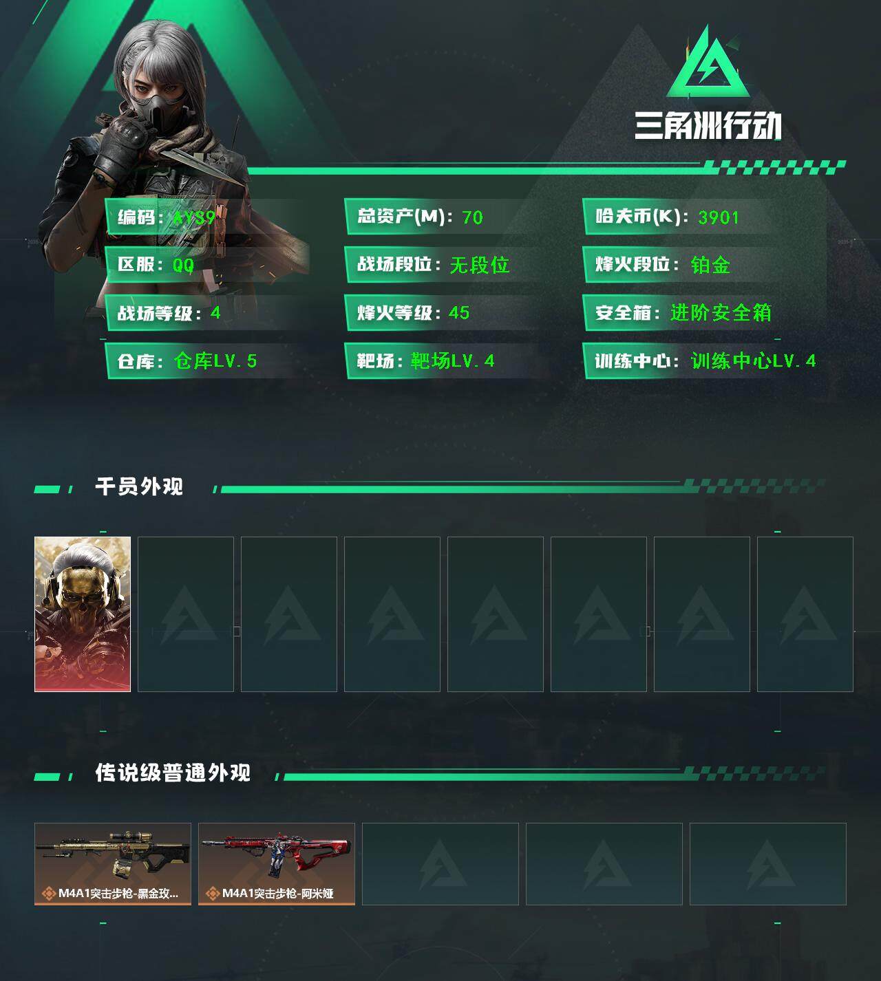 - [11526524]总资产:36.4M 1传说枪械 哈夫币:5.232K 可二次 可修改实名 烽火地带段位:无段位 全面战场段位:无段位 传说武器皮肤:勇士冲锋枪-能天使-午夜邮差 史诗武器皮肤:勇士冲锋枪-深海恐惧