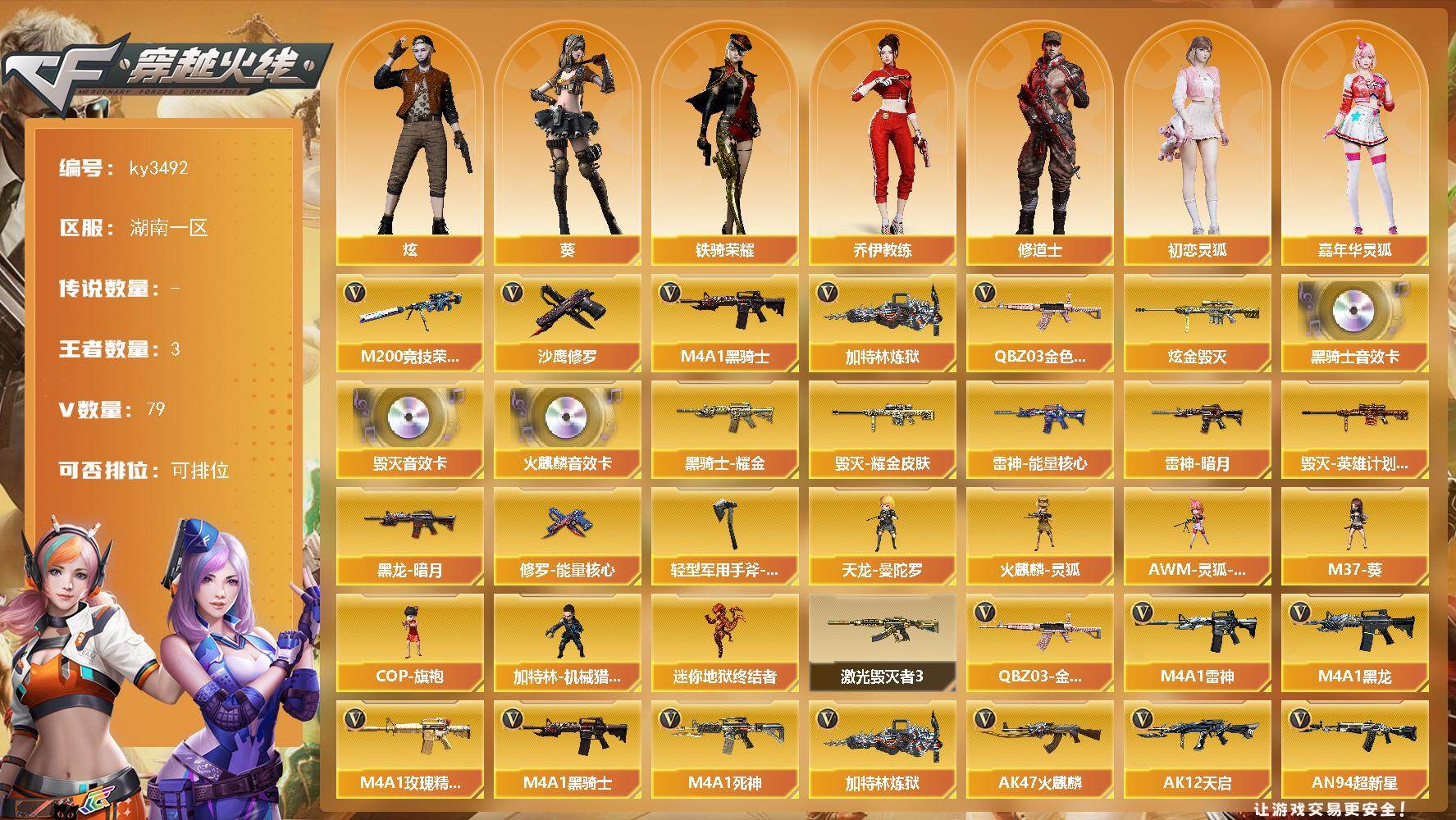 [13751813]湖南一区-79V-3王者-1炫金 【热门武器】:QBZ03-金色蔷薇,M200-竞技荣光,M4A1-黑骑士,加特林-炼狱*4,沙鹰-修罗*5 【王者炫金武器】:炫金毁灭 【音效卡】:AK47-火麒麟音效卡,M4A1-黑骑士音效卡,Barrett-毁灭音效卡 【皮肤】:雷神-暗月,雷神-能量核心,毁灭耀金皮肤,毁灭-英雄计划 皮肤,黑龙-暗月,黑骑士耀金皮肤,修罗-能量核心,轻型军用手斧-再燃火线 【角色】:葵,炫,乔伊教练,修道士,初恋灵狐,嘉年华灵狐,娟娟,兰-海滩派对,曼陀罗-X,潘多拉-X,铁骑荣耀 【人偶武器】:天龙-曼陀罗,火麒麟-灵狐,加特林-机械猎手,迷你地狱终结者,AWM-灵狐-15周年嘉年华,M37-葵,COP-旗袍 【挑战大师】:激光毁灭者III 【英雄级武器】:AK47-火麒麟,M4A1-黑龙,M4A1-雷神*2,M4A1-黑骑士,M4A1-死神,AK12-天启,AN94-超新星*3,AK47-机械迷城,AK47-黑鲨,M4A1-雷霆,M4A1-玫瑰精灵,QBZ03-金色蔷薇,王者之影-觉醒版,AWM-天龙*2,Barrett-毁灭,Barrett-极光,AWM-裁决,M200-竞技荣光,加特林-炼狱*4,AA-12-雷霆,沙鹰-修罗*5,沙鹰-天神*2,雷霆之契,王者之魂-觉醒版,屠龙*3,龙啸,擎天,麒麟刺*2,擎天-竞技荣光,麒麟刺-百战金芒,王者之锋-觉醒版,高爆手雷-雷霆*7,高爆手雷-竞技荣光*3,闪光弹-雷霆*7,闪光弹-竞技荣光*3,烟雾弹-雷霆*7,烟雾弹-竞技荣光*4 【道具】:战舰背包,炫彩背包,百战金芒炫彩背包,女皇终结者-魔龙之吻,绿色巨人,灵魂忍者,迷雾幽灵,生化弹匣,夺命之镰,防化服*3,金色流光-枪王排位*2,星辰流光-枪王排位,流光-鎏金之域,枪王排位28赛季金色流光,萌萌小葵表情,C4-红龙,防弹头盔*4,防弹衣*4,C4工具钳*4,手雷包*4 【特殊枪械】:1黑骑士,4炼狱