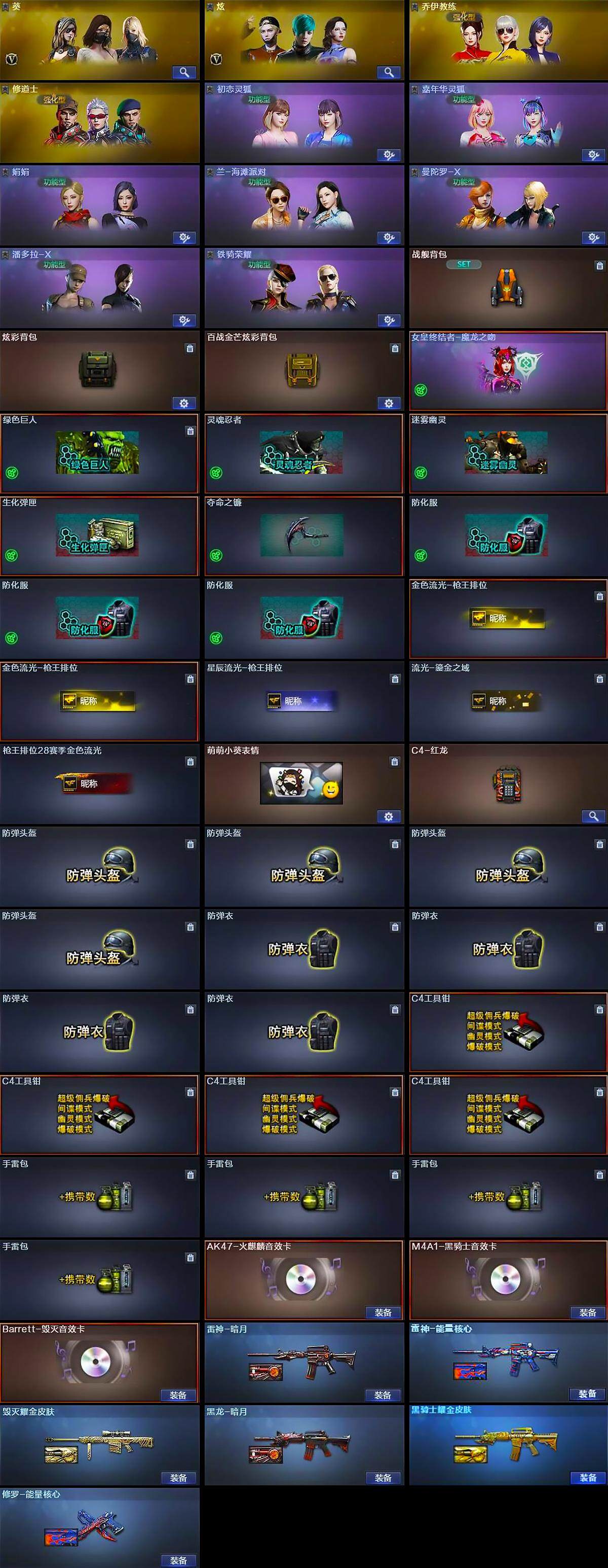 【道具】:战舰背包,炫彩背包,百战金芒炫彩背包,女皇终结者-魔龙之吻,绿色巨人,灵魂忍者,迷雾幽灵,生化弹匣,夺命之镰,防化服*3,金色流光-枪王排位*2,星辰流光-枪王排位,流光-鎏金之域,枪王排位28赛季金色流光,萌萌小葵表情,C4-红龙,防弹头盔*4,防弹衣*4,C4工具钳*4,手雷包*4