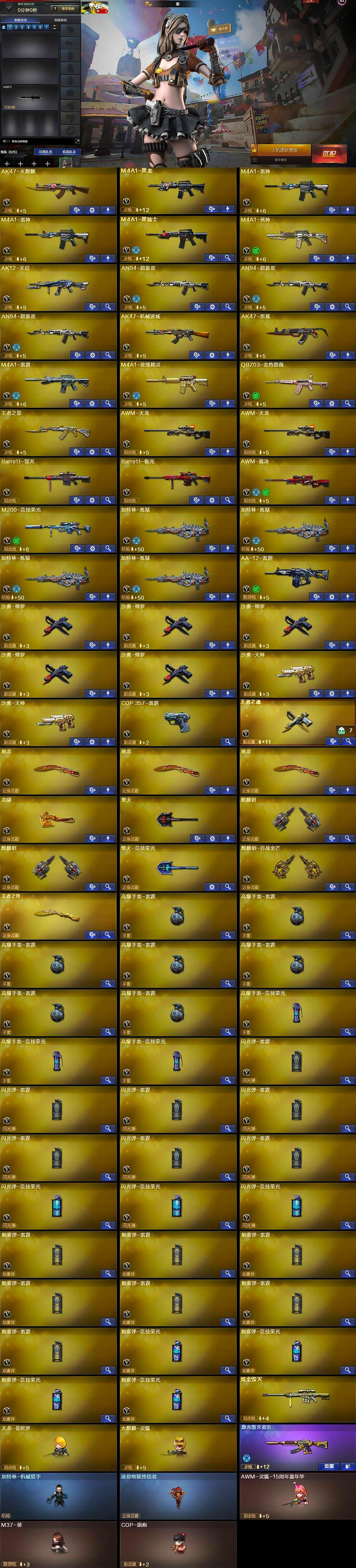 【英雄级武器】:AK47-火麒麟,M4A1-黑龙,M4A1-雷神*2,M4A1-黑骑士,M4A1-死神,AK12-天启,AN94-超新星*3,AK47-机械迷城,AK47-黑鲨,M4A1-雷霆,M4A1-玫瑰精灵,QBZ03-金色蔷薇,王者之影-觉醒版,AWM-天龙*2,Barrett-毁灭,Barrett-极光,AWM-裁决,M200-竞技荣光,加特林-炼狱*4,AA-12-雷霆,沙鹰-修罗*5,沙鹰-天神*2,雷霆之契,王者之魂-觉醒版,屠龙*3,龙啸,擎天,麒麟刺*2,擎天-竞技荣光,麒麟刺-百战金芒,王者之锋-觉醒版,高爆手雷-雷霆*7,高爆手雷-竞技荣光*3,闪光弹-雷霆*7,闪光弹-竞技荣光*3,烟雾弹-雷霆*7,烟雾弹-竞技荣光*4