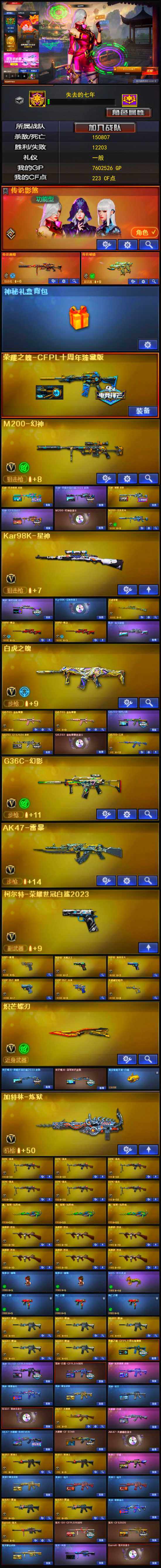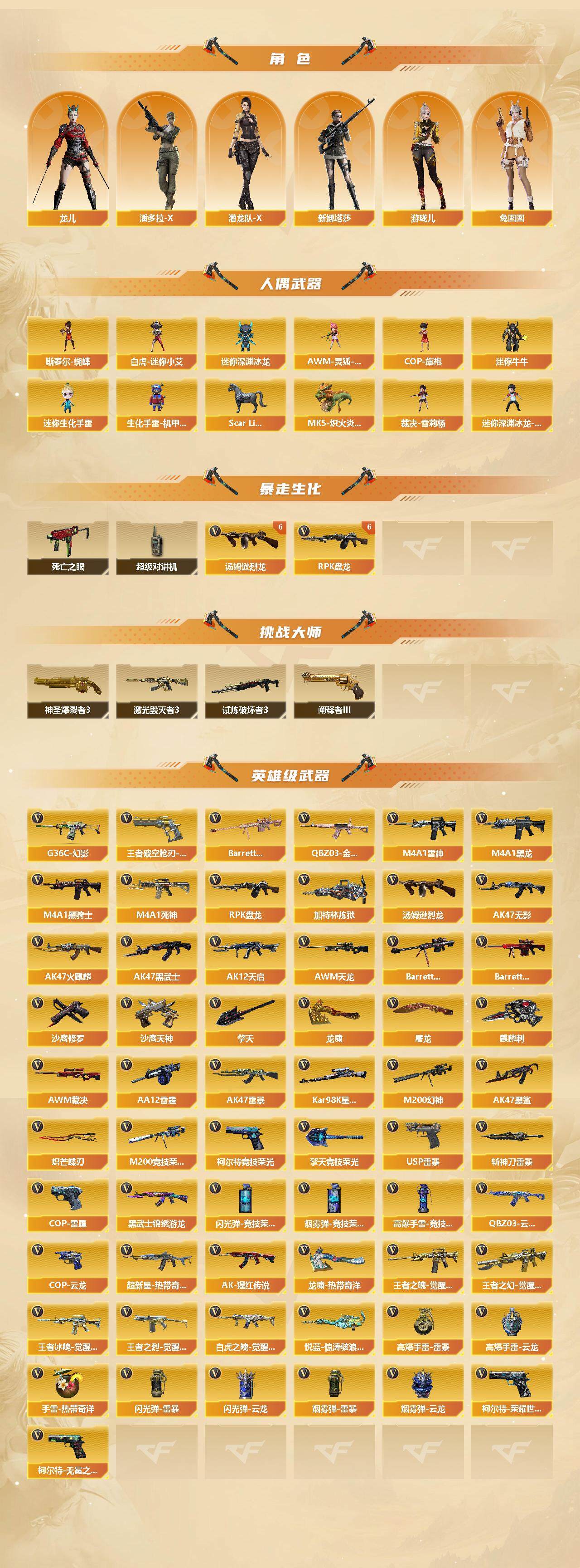 【皮肤】:幻神-CFS2022,幻神-星耀 皮肤,幻神-荣耀世冠白鲨2023 皮肤,幻神-传奇欧欧 皮肤,QBZ03-冠军之薇,QBZ03-CFS2024 皮肤,裁决-流光秘银,星神-巅峰荣耀 皮肤,雷神-能量核心,雷神-星空,雷神-耀金皮肤,雷神-R.LGD-CFPLS18冠军,荣耀之魄-CFPL十周年臻藏版,AK47-火麒麟-传奇EVEN,火麒麟-白虎,毁灭耀金皮肤,毁灭-CFS2020,毁灭-SV-CFPLS16冠军,毁灭-风暴,黑龙-能量核心,黑骑士-暗月*2,黑骑士耀金皮肤,黑骑士-伏羲,天龙-能量核心,极光-能量核心,炼狱-虎牙皮肤,修罗-能量核心*2,屠龙-星火燎原,屠龙-星耀 皮肤,龙啸-纸灯龙皮肤,擎天-冠军之击,麒麟刺-荣耀世冠白鲨,炽芒蝶刃-冠军炽芒皮肤,炽芒蝶刃-荣耀世冠白鲨2023 皮肤
