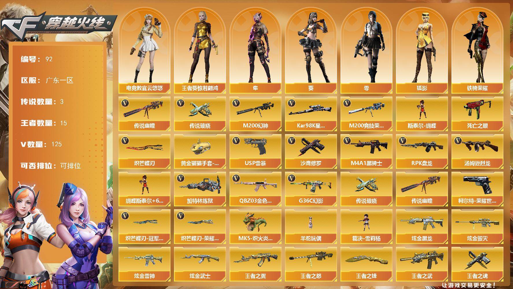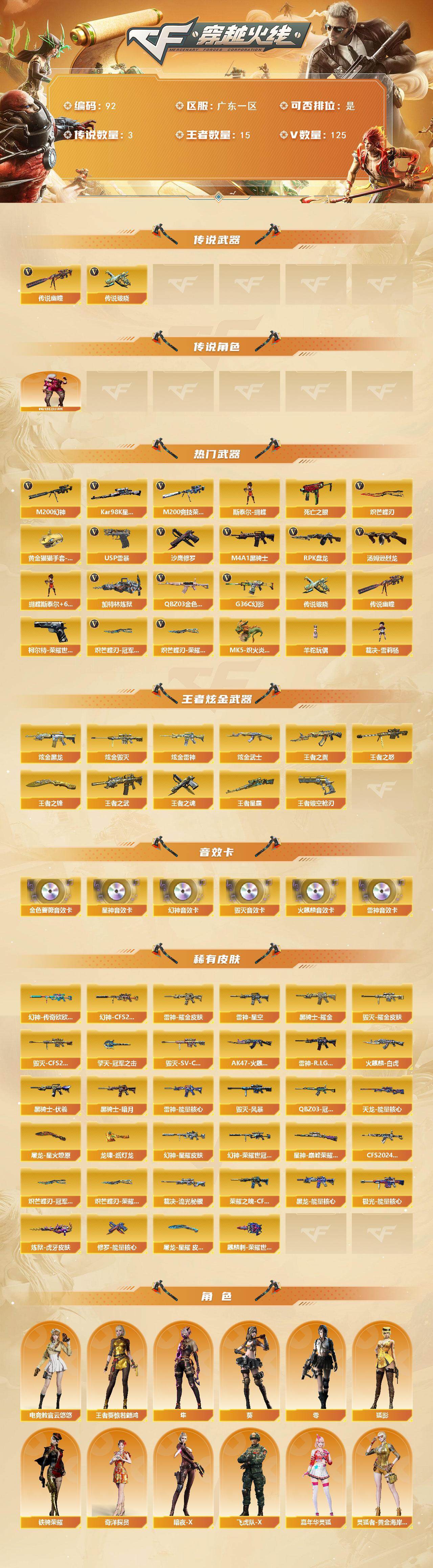 [13751120]广东一区-125V-15王者-4炫金 【传说武器】:传说幽瞳,传说破晓 【传说角色】:传说影煞 【热门武器】:传说幽瞳,传说破晓,G36C-幻影,QBZ03-金色蔷薇*2,M200-幻神,柯尔特-荣耀世冠白鲨2023,M200-竞技荣光,死亡之眼*3,Kar98K-星神,M4A1-黑骑士*2,汤姆逊-烈龙*6,RPK-盘龙*6,加特林-炼狱,斯泰尔-蝴蝶*2,MK5-炽火炎龙,羊驼玩偶,裁决-雪莉杨*2,USP-雷暴,沙鹰-修罗,炽芒蝶刃,炽芒蝶刃-冠军炽芒皮肤,炽芒蝶刃-荣耀世冠白鲨2023 皮肤,黄金猫猫手套-白鲨 【王者炫金武器】:王者之翼,王者之武,王者之怒,王者星霆,王者之魂,王者破空枪刃,王者之锋,炫金黑龙,炫金雷神,炫金武士,炫金毁灭 【音效卡】:M200-幻神音效卡,AK47-火麒麟音效卡,M4A1-雷神音效卡,Barrett-毁灭音效卡,QBZ03-金色蔷薇音效卡,Kar98K-星神音效卡 【皮肤】:幻神-CFS2022,幻神-星耀 皮肤,幻神-荣耀世冠白鲨2023 皮肤,幻神-传奇欧欧 皮肤,QBZ03-冠军之薇,QBZ03-CFS2024 皮肤,裁决-流光秘银,星神-巅峰荣耀 皮肤,雷神-能量核心,雷神-星空,雷神-耀金皮肤,雷神-R.LGD-CFPLS18冠军,荣耀之魄-CFPL十周年臻藏版,AK47-火麒麟-传奇EVEN,火麒麟-白虎,毁灭耀金皮肤,毁灭-CFS2020,毁灭-SV-CFPLS16冠军,毁灭-风暴,黑龙-能量核心,黑骑士-暗月*2,黑骑士耀金皮肤,黑骑士-伏羲,天龙-能量核心,极光-能量核心,炼狱-虎牙皮肤,修罗-能量核心*2,屠龙-星火燎原,屠龙-星耀 皮肤,龙啸-纸灯龙皮肤,擎天-冠军之击,麒麟刺-荣耀世冠白鲨,炽芒蝶刃-冠军炽芒皮肤,炽芒蝶刃-荣耀世冠白鲨2023 皮肤 【角色】:零,葵,电竞教官-云悠悠,隼,王者葵-惊若翩鸿,狐影,奇洋探员,暗夜-X,飞虎队-X,嘉年华灵狐,灵狐者-黄金海岸,龙儿,潘多拉-X,潜龙队-X,铁骑荣耀,兔囡囡,新娜塔莎,游珑儿 【人偶武器】:裁决-雪莉杨*2,白虎-迷你小艾,MK5-炽火炎龙,斯泰尔-蝴蝶*2,Scar Light-马枪,AWM-灵狐-15周年嘉年华,COP-旗袍,迷你深渊冰龙,迷你牛牛,迷你生化手雷,生化手雷-机甲核心*2,迷你深渊冰龙-王绿豆 【暴走生化】:死亡之眼