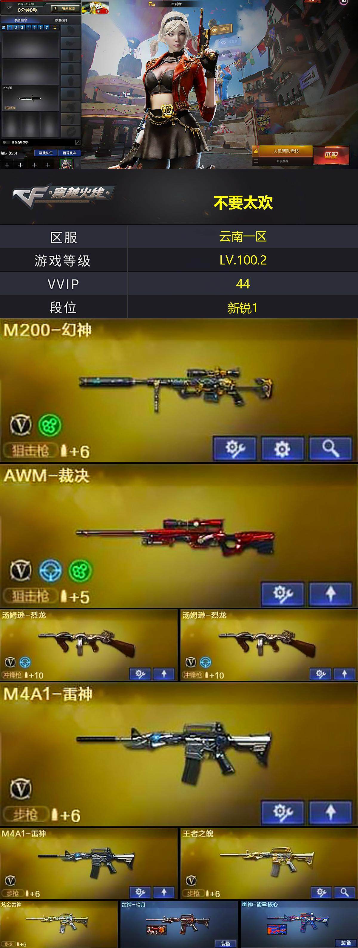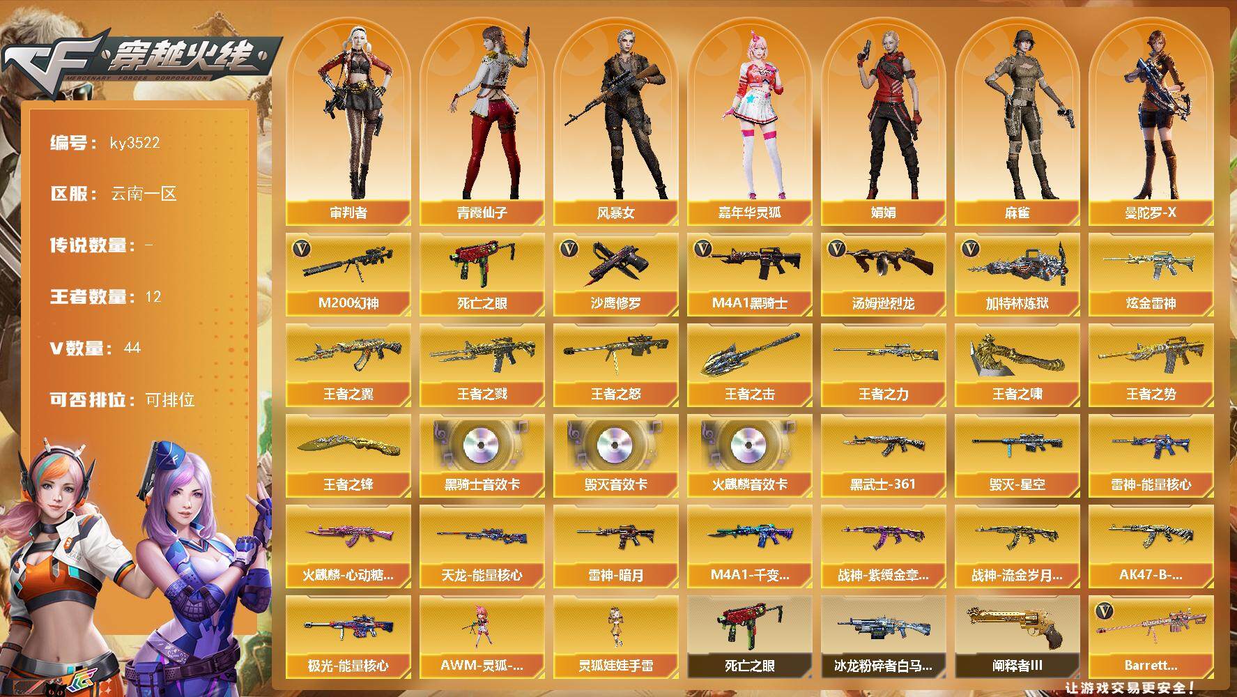 [13757373]云南一区-44V-12王者-1炫金 【热门武器】:M200-幻神,死亡之眼,M4A1-黑骑士,汤姆逊-烈龙*2,加特林-炼狱,沙鹰-修罗*3 【王者炫金武器】:王者之戮,王者之翼,王者之势,王者之怒,王者之力*2,王者之啸,王者之击,王者之锋,炫金雷神 【音效卡】:AK47-火麒麟音效卡,M4A1-黑骑士音效卡,Barrett-毁灭音效卡 【皮肤】:雷神-暗月,雷神-能量核心,火麒麟-心动糖果,毁灭-星空,M4A1-千变-孔明皮肤,AK47-黑武士-361,战神-紫绶金章皮肤,战神-流金岁月皮肤,AK47-B-常胜将军-刘备,天龙-能量核心,极光-能量核心 【角色】:审判者,风暴女,嘉年华灵狐,娟娟,麻雀,曼陀罗-X,潘多拉-X,潜龙队-X,青霞仙子,斯沃特-X 【人偶武器】:AWM-灵狐-15周年嘉年华,灵狐娃娃手雷 【暴走生化】:死亡之眼 【挑战大师】:冰龙粉碎者-白马银枪,阐释者III 【英雄级武器】:AK47-火麒麟*3,M4A1-雷神*2,M4A1-黑骑士,M4A1-死神,AK47-黑武士,M4A1-武圣,AK47-黑鲨,M4A1-龙血*4,王者之武-觉醒版,王者之魄-觉醒版,AK-47-猩红传说,AWM-天龙,Barrett-毁灭*2,Barrett-极光,AWM-裁决,M200-幻神,Barrett-金色蔷薇,加特林-炼狱,汤姆逊-烈龙*2,沙鹰-修罗*3,沙鹰-天神*2,屠龙,龙啸,麒麟刺-堕天神,擎天,麒麟刺*3,王者之击-觉醒版,高爆手雷-堕天神,闪光弹-堕天神,烟雾弹-堕天神 【道具】:超级背包,夺命之镰,防化服,金色流光-枪王排位*2,星辰流光-枪王排位,巅峰赛先锋-金色流光,枪王排位28赛季金色流光,防弹头盔,防弹衣*2,C4工具钳,手雷包 【特殊枪械】:1黑骑士,2烈龙,1炼狱