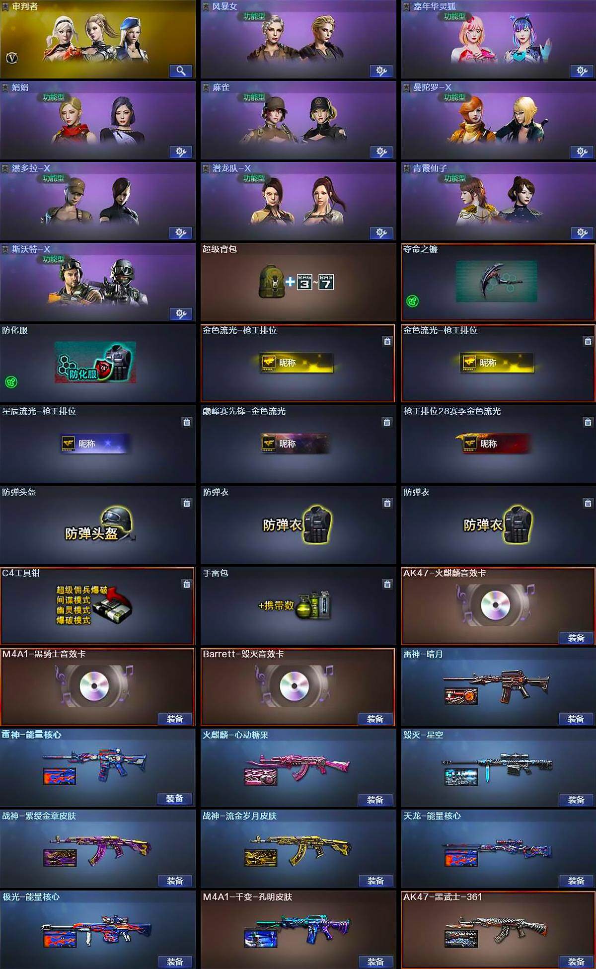 【道具】:超级背包,夺命之镰,防化服,金色流光-枪王排位*2,星辰流光-枪王排位,巅峰赛先锋-金色流光,枪王排位28赛季金色流光,防弹头盔,防弹衣*2,C4工具钳,手雷包