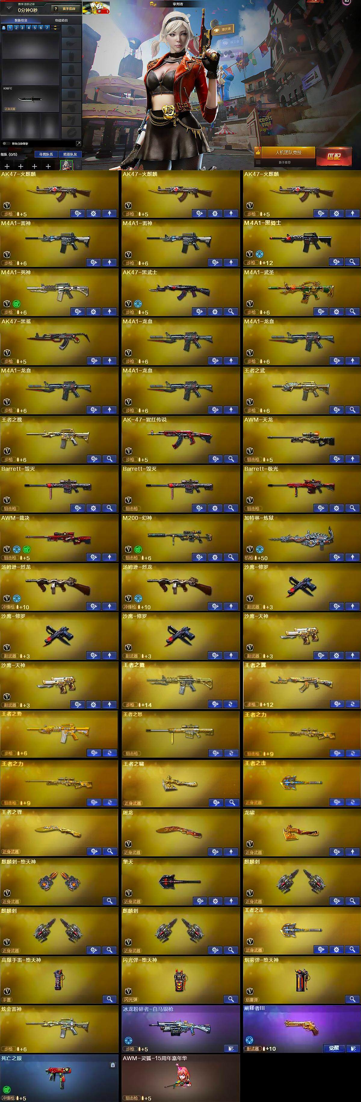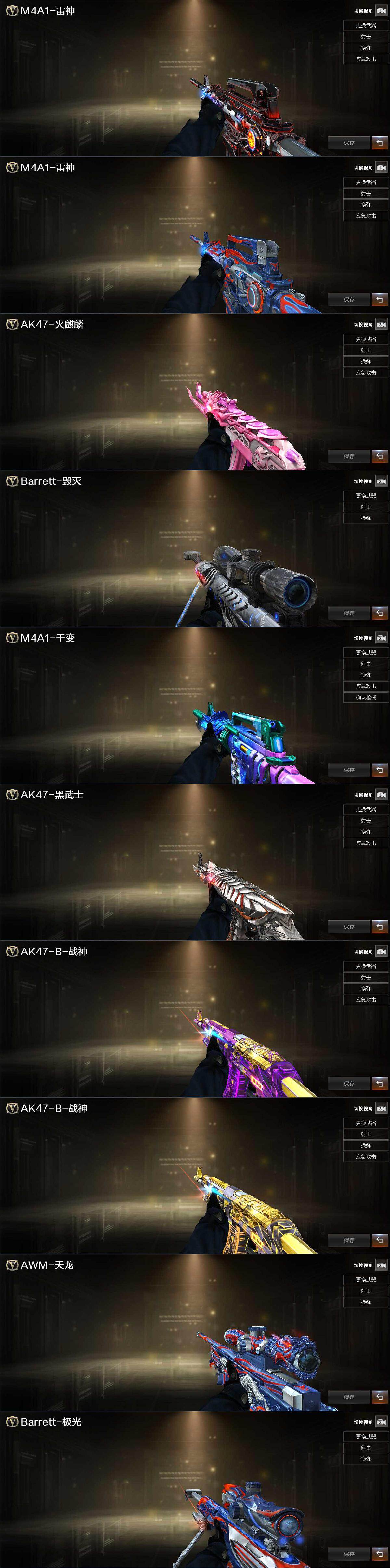 【英雄级武器】:AK47-火麒麟*3,M4A1-雷神*2,M4A1-黑骑士,M4A1-死神,AK47-黑武士,M4A1-武圣,AK47-黑鲨,M4A1-龙血*4,王者之武-觉醒版,王者之魄-觉醒版,AK-47-猩红传说,AWM-天龙,Barrett-毁灭*2,Barrett-极光,AWM-裁决,M200-幻神,Barrett-金色蔷薇,加特林-炼狱,汤姆逊-烈龙*2,沙鹰-修罗*3,沙鹰-天神*2,屠龙,龙啸,麒麟刺-堕天神,擎天,麒麟刺*3,王者之击-觉醒版,高爆手雷-堕天神,闪光弹-堕天神,烟雾弹-堕天神