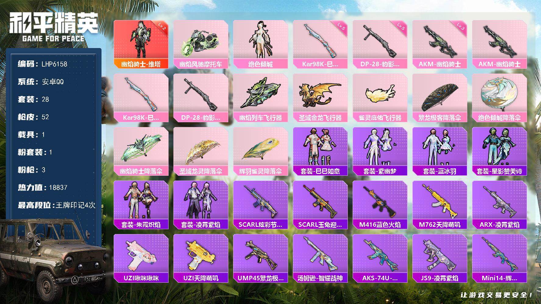 [13752220]可二次【店主推荐捡漏号!可直接换绑】/素材身法号 安卓 手Q-1神装-1粉装-3特效枪-1载具-3粉色飞行器-1.8w热力值-4王牌印记-28套装-52枪皮【红色神装等级】:幽焰骑士-维塔(二级)【粉色载具】:幽焰风驰摩托车【粉色套装】:角色-绝色倾城【粉色枪皮等级】:AKM-幽焰骑士(三级),Kar98K-巳巳如意(五级),DP-28-豹影疾电(五级)【粉色飞行器】:幽焰列车飞行器,圣域金龙飞行器,雀灵庇佑飞行器