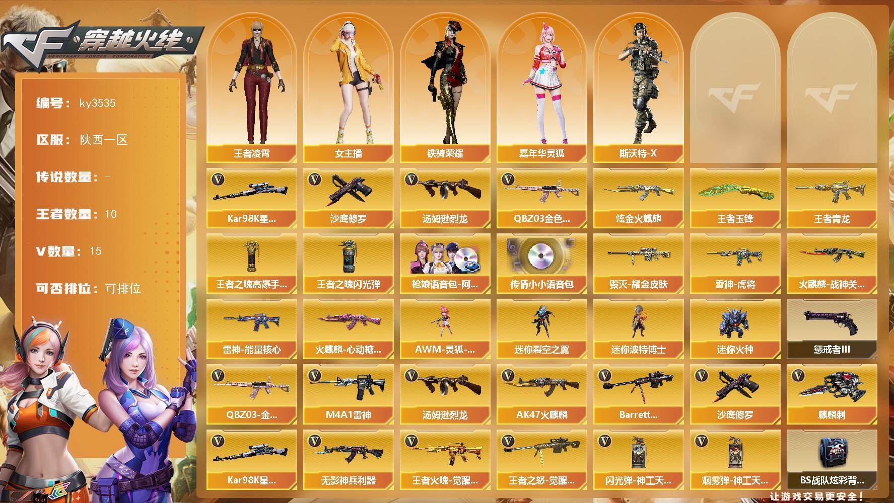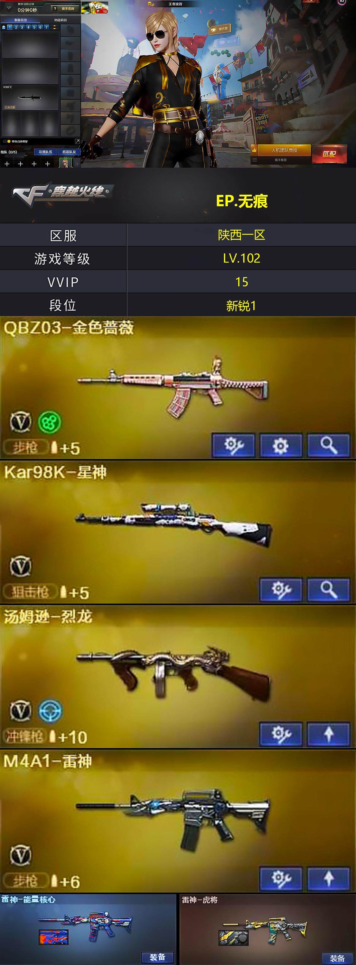 [13752710]陕西一区-15V-10王者-1炫金 【热门武器】:QBZ03-金色蔷薇,Kar98K-星神,汤姆逊-烈龙,沙鹰-修罗 【王者炫金武器】:王者青龙,王者玉锋,炫金火麒麟,王者之魄高爆手雷*2,王者之魄闪光弹*3 【音效卡】:枪娘语音包-阿敏,传情小小语音包 【皮肤】:雷神-能量核心,雷神-虎将,火麒麟-战神关羽,火麒麟-心动糖果,毁灭耀金皮肤 【角色】:王者凌霄,嘉年华灵狐,女主播,斯沃特-X,铁骑荣耀 【人偶武器】:AWM-灵狐-15周年嘉年华,迷你裂空之翼,迷你波特博士*4,迷你火种*3 【挑战大师】:惩戒者III 【英雄级武器】:AK47-火麒麟,M4A1-雷神,无影-神兵利器,QBZ03-金色蔷薇,王者火魄-觉醒版,Barrett-毁灭,Kar98K-星神,王者之怒-觉醒版,汤姆逊-烈龙,沙鹰-修罗,麒麟刺,闪光弹-神工天巧*3,烟雾弹-神工天巧*3 【道具】:BS战队炫彩背包,Q9战队炫彩背包,黄金巨石泰坦-魔花研究所背包,夺命之镰,防化服,金色流光-枪王排位*2,星辰流光-枪王排位,防弹头盔*3,防弹衣*3,C4工具钳,手雷包 【特殊枪械】:1烈龙