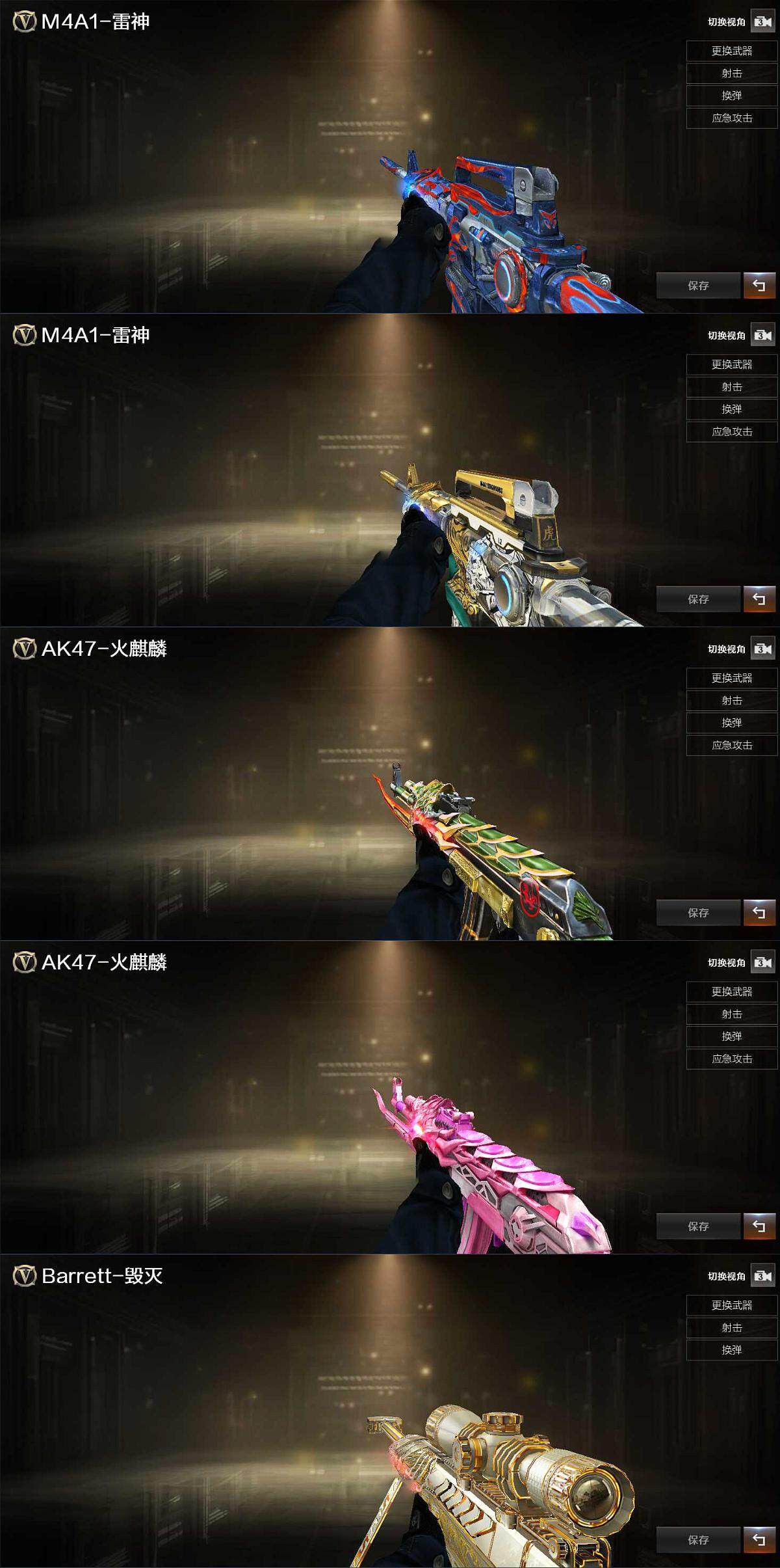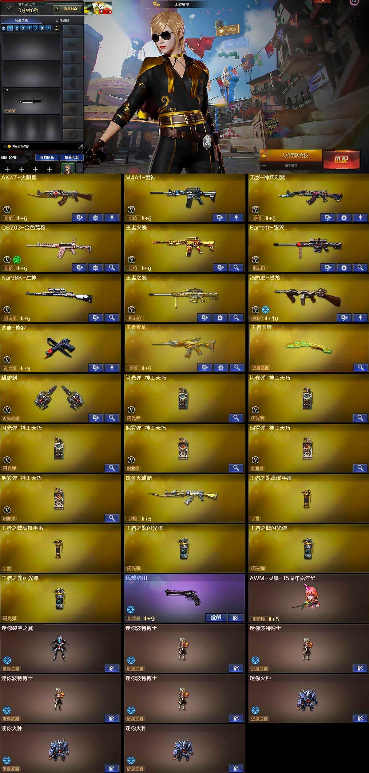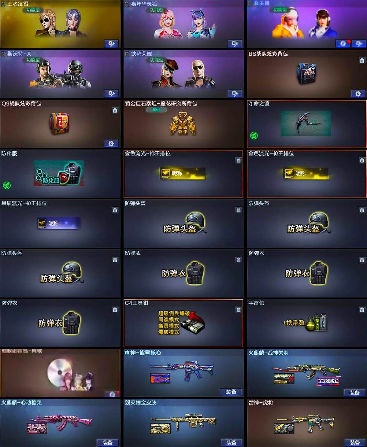 【英雄级武器】:AK47-火麒麟,M4A1-雷神,无影-神兵利器,QBZ03-金色蔷薇,王者火魄-觉醒版,Barrett-毁灭,Kar98K-星神,王者之怒-觉醒版,汤姆逊-烈龙,沙鹰-修罗,麒麟刺,闪光弹-神工天巧*3,烟雾弹-神工天巧*3