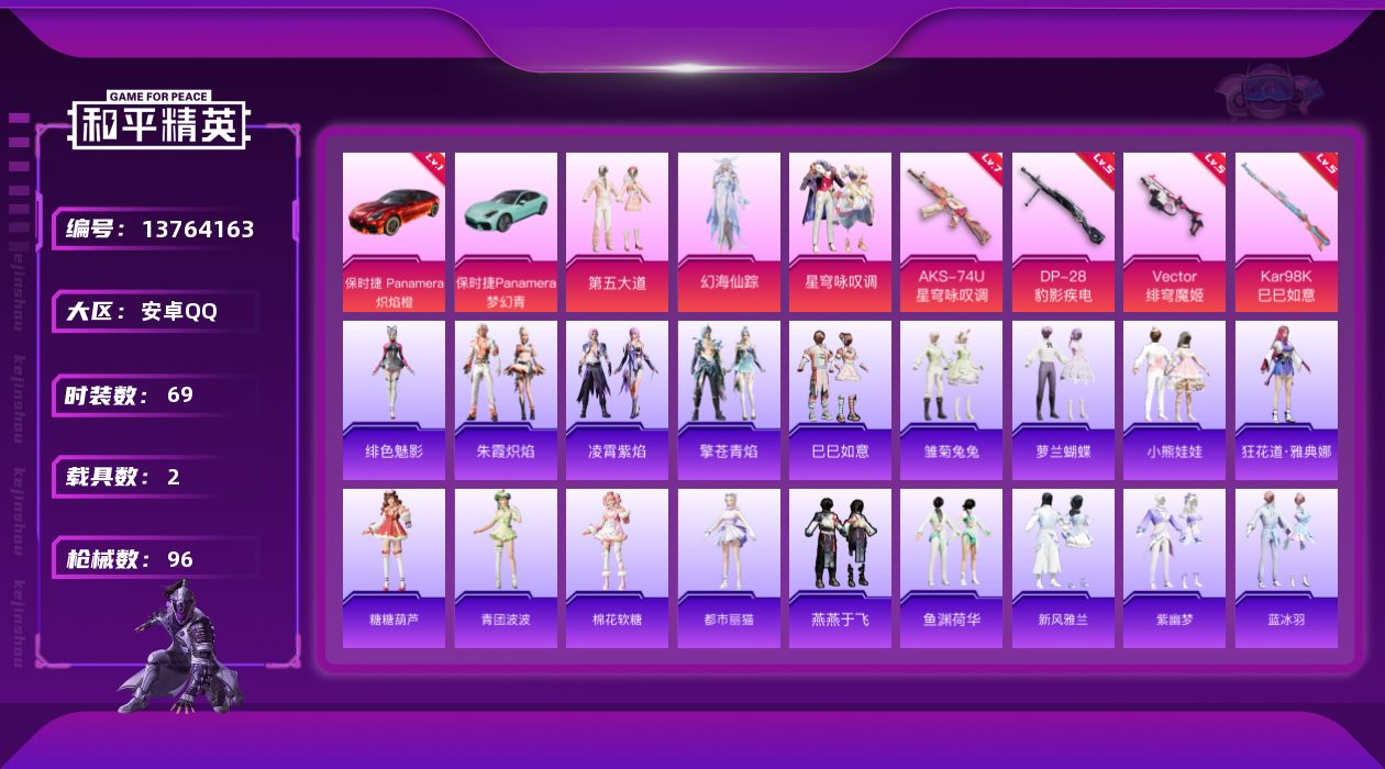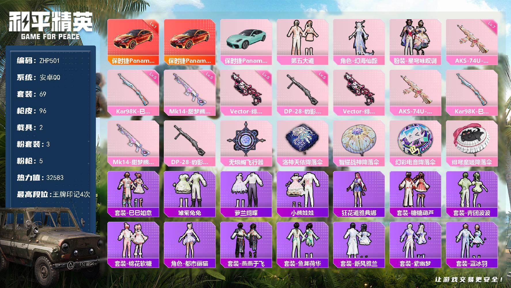 [13764163]可二次【店主推荐捡漏号!可直接换绑】/素材身法号/地铁满天赋 安卓 手Q-3粉装-5特效枪-2载具-1粉色飞行器-3.2w热力值-4王牌印记-69套装-96枪皮【红色载具】:保时捷Panamera(炽焰橙)(一级)【粉色载具】:保时捷Panamera(炽焰橙),保时捷Panamera(梦幻青)【粉色套装】:粉装-第五大道,角色-幻海仙踪,粉装-星穹咏叹调【粉色枪皮等级】:Vector-绯穹魔姬(五级),AKS-74U-星穹咏叹调(七级),Kar98K-巳巳如意(五级),Mk14-甜梦熊击(五级),DP-28-豹影疾电(五级)【粉色飞行器】:无垠阁飞行器