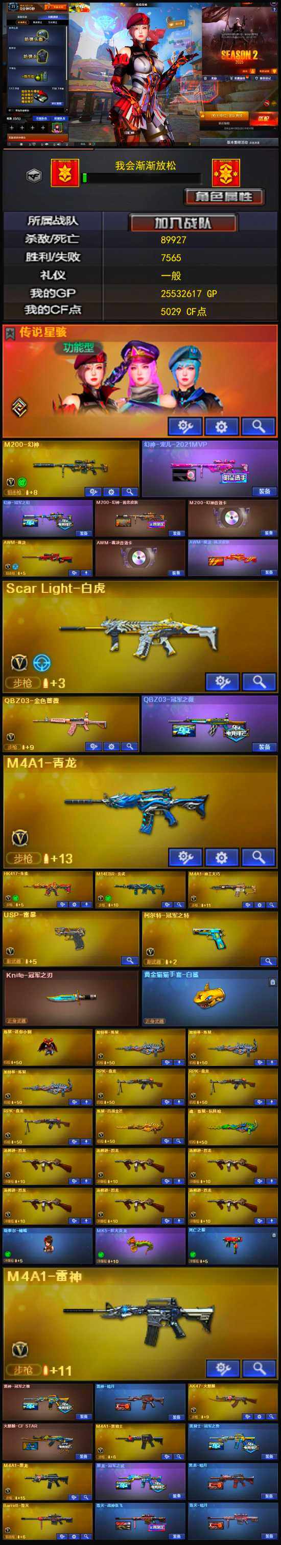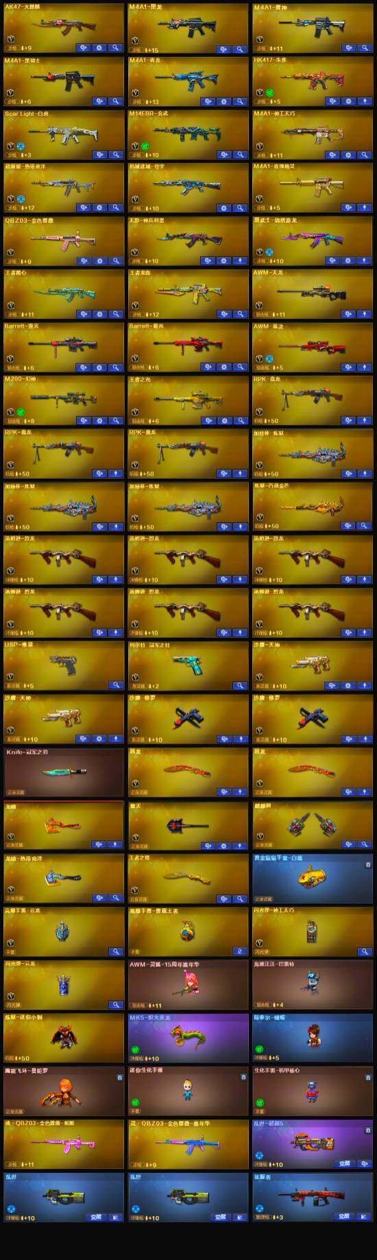 【热门武器】:QBZ03-金色蔷薇,M14EBR-玄武,Scar Light-白虎,HK417-朱雀,M4A1-青龙,M200-幻神,死亡之眼,柯尔特-冠军之特,炼狱-迷你小钢,M4A1-黑骑士,汤姆逊-烈龙*6,RPK-盘龙*3,加特林-炼狱*3,斯泰尔-蝴蝶,MK5-炽火炎龙,USP-雷暴,沙鹰-修罗*2,Knife-冠军之刃,黄金猫猫手套-白鲨