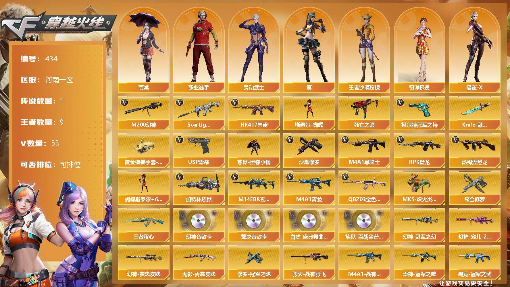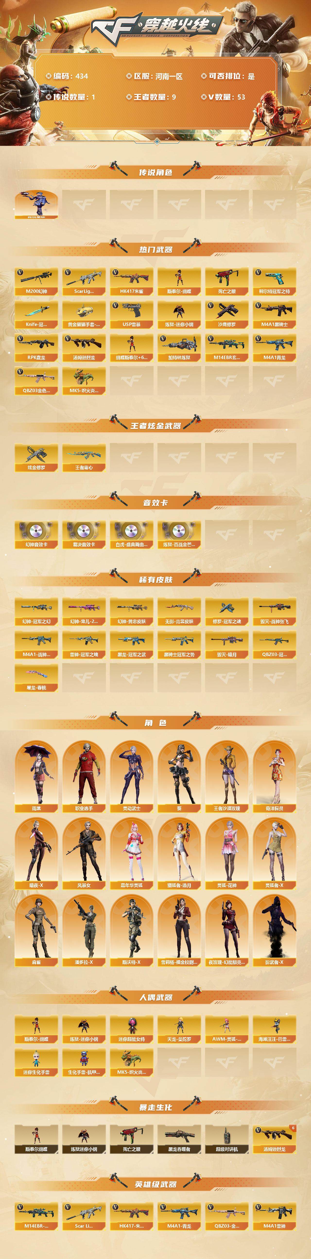 [13130464]河南一区-53V-9王者-1炫金 【传说角色】:传说星骇 【热门武器】:QBZ03-金色蔷薇,M14EBR-玄武,Scar Light-白虎,HK417-朱雀,M4A1-青龙,M200-幻神,死亡之眼,柯尔特-冠军之特,炼狱-迷你小钢,M4A1-黑骑士,汤姆逊-烈龙*6,RPK-盘龙*3,加特林-炼狱*3,斯泰尔-蝴蝶,MK5-炽火炎龙,USP-雷暴,沙鹰-修罗*2,Knife-冠军之刃,黄金猫猫手套-白鲨 【王者炫金武器】:王者霜心,炫金修罗 【音效卡】:M200-幻神音效卡,AWM-裁决音效卡,白虎-盛典舞曲音效卡,炼狱-百战金芒-庆典舞曲音效卡 【皮肤】:M200-幻神-黄忠皮肤,幻神-冠军之幻,幻神-宠儿-2021MVP,QBZ03-冠军之薇,AWM-裁决-凤灵皮肤,雷神-暗月,雷神-冠军之魄,M4A1-战神赵云,M4A1-再燃火线,毁灭-暗月,毁灭-战神张飞,黑龙-暗月,黑龙-冠军之武,黑骑士-冠军之势,无影-能量核心,无影-霓裳皮肤,天启-暗月,玫瑰精灵-粉色浪漫 皮肤,战神-流金岁月皮肤,AK47-B-常胜将军-曹操,极光-能量核心,修罗-能量核心,修罗-冠军之魂,屠龙-春桃 皮肤,轻型军用手斧-再燃火线,擎天-秘银 【角色】:葵,雨棠,王者沙漠玫瑰,奇洋探员,暗夜-X,风暴女,嘉年华灵狐,猎狐者-追月,灵动武士,灵狐-花神,灵狐者-X,麻雀,潘多拉-X,斯沃特-X,雪莉杨-摸金校尉,夜玫瑰-幻能朋克,影武者-X,职业选手 【人偶武器】:天龙-曼陀罗,炼狱-迷你小钢,MK5-炽火炎龙,斯泰尔-蝴蝶,AWM-灵狐-15周年嘉年华,海滩汪汪-巴雷特,迷你超能女侍,迷你生化手雷,生化手雷-机甲核心 【暴走生化】:炼狱-迷你小钢,黑龙吞噬者,斯泰尔-蝴蝶,死亡之眼,超级对讲机 【英雄级武器】:AK47-火麒麟,M4A1-黑龙,M4A1-雷神,M4A1-黑骑士,M4A1-青龙,HK417-朱雀,Scar Light-白虎,M14EBR-玄武,M4A1-神工天巧,无影-神兵利器,黑武士-锦绣游龙,超新星-热带奇洋,M4A1-玫瑰精灵,QBZ03-金色蔷薇,AK-47-猩红传说,王者龙血-觉醒版,AWM-天龙,Barrett-毁灭,Barrett-极光,AWM-裁决,M200-幻神,王者之光-觉醒版,RPK-盘龙*3,加特林-炼狱*3,炼狱-百战金芒,汤姆逊-烈龙