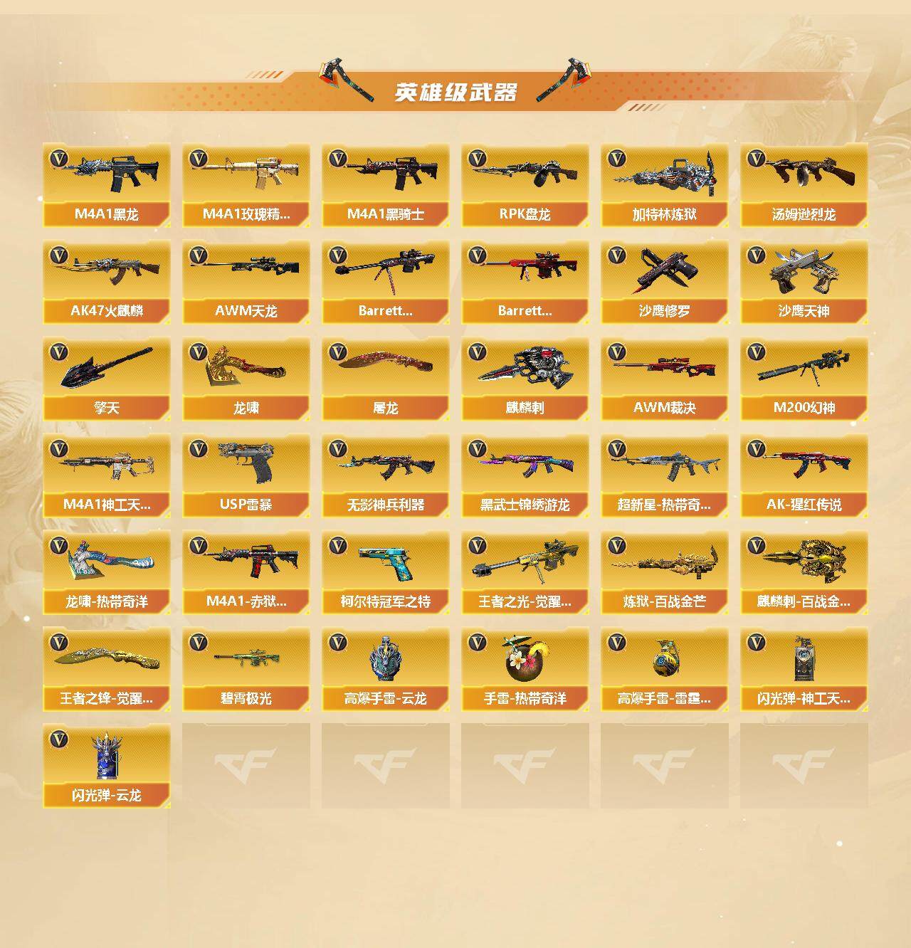 【英雄级武器】:AK47-火麒麟,M4A1-黑龙,M4A1-雷神,M4A1-黑骑士,M4A1-青龙,HK417-朱雀,Scar Light-白虎,M14EBR-玄武,M4A1-神工天巧,无影-神兵利器,黑武士-锦绣游龙,超新星-热带奇洋,M4A1-玫瑰精灵,QBZ03-金色蔷薇,AK-47-猩红传说,王者龙血-觉醒版,AWM-天龙,Barrett-毁灭,Barrett-极光,AWM-裁决,M200-幻神,王者之光-觉醒版,RPK-盘龙*3,加特林-炼狱*3,炼狱-百战金芒,汤姆逊-烈龙