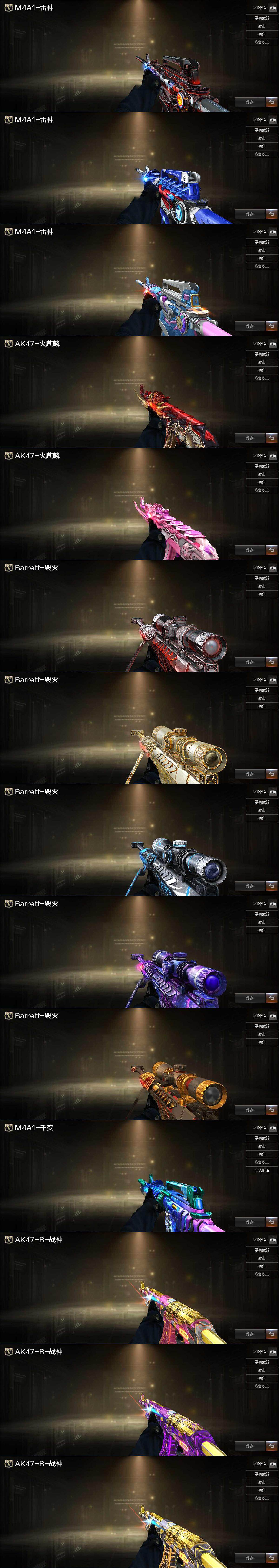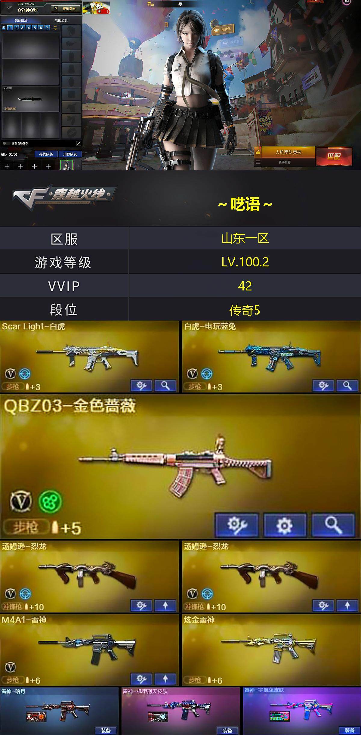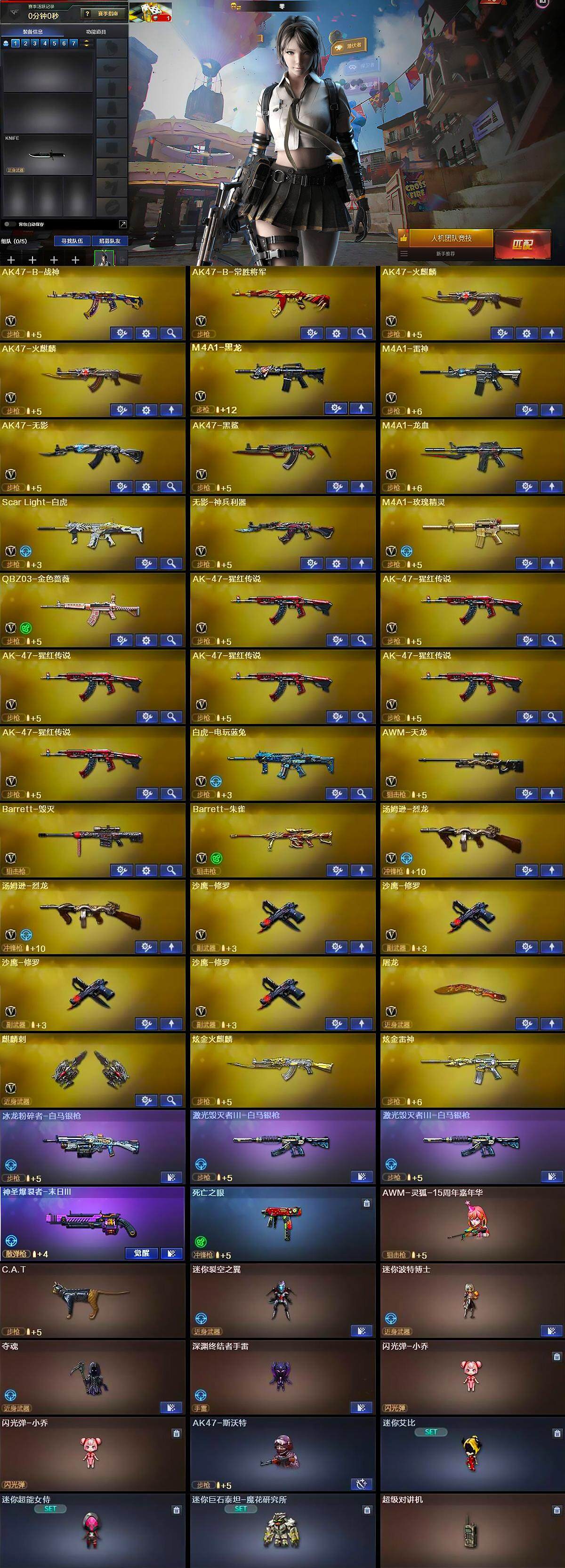 【英雄级武器】:AK47-火麒麟*2,M4A1-黑龙,M4A1-雷神,AK47-无影,AK47-黑鲨,M4A1-龙血,Scar Light-白虎,无影-神兵利器,M4A1-玫瑰精灵,QBZ03-金色蔷薇,AK-47-猩红传说*6,AK47-B-战神,AK47-B-常胜将军,白虎-电玩蓝兔,AWM-天龙,Barrett-毁灭,Barrett-朱雀,汤姆逊-烈龙*2,沙鹰-修罗*4,屠龙,麒麟刺
