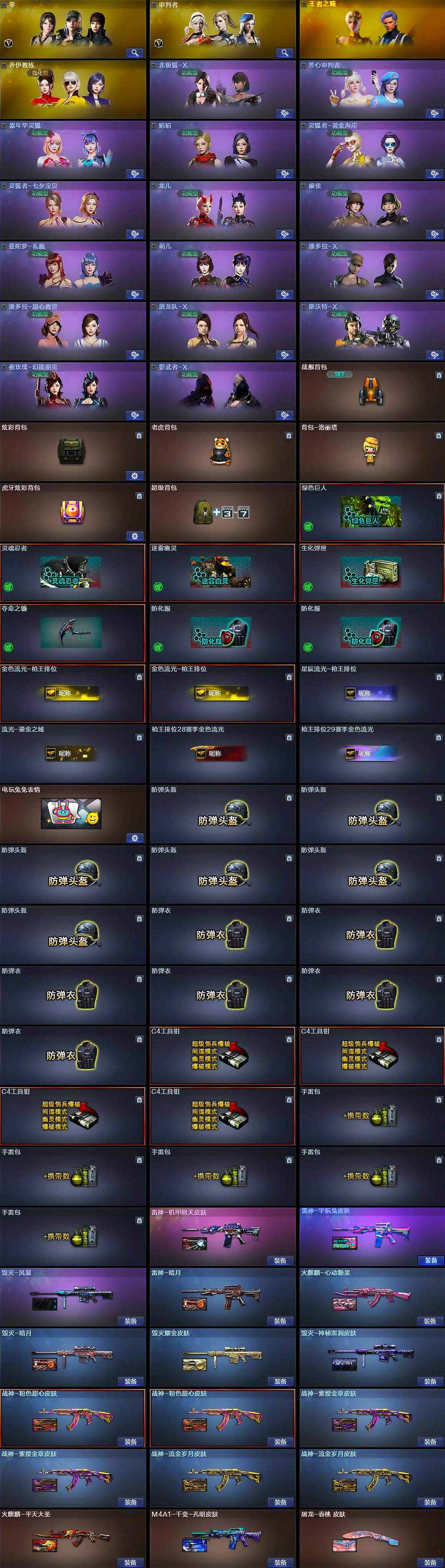 【道具】:战舰背包,炫彩背包,老虎背包,背包-洛丽塔,虎牙炫彩背包,超级背包,绿色巨人,灵魂忍者,迷雾幽灵,生化弹匣,夺命之镰,防化服*2,金色流光-枪王排位*2,星辰流光-枪王排位,流光-鎏金之域,枪王排位28赛季金色流光,枪王排位29赛季金色流光,电玩兔兔表情,防弹头盔*6,防弹衣*6,C4工具钳*4,手雷包*5