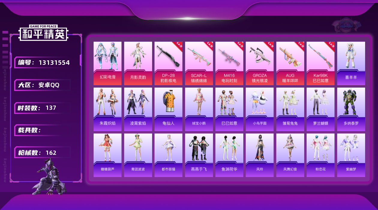 - PX_1938502-实名: 可修改 时装数: 231 载具数: 4 枪械数: 105 战备数: 73 神级装扮: 镜域双华-欧若拉 热门装扮: 木曜青龙,相思残雪,小可学妹,白勺歌姬,闲梦青缨,圣堂之誓,创世·救赎,星梦奇缘,初号机 觉醒Ver.,狂花道·不知火舞 载具: 路特斯ELETRE(冰川蓝),宾利飞驰(布罗德盖棕双色),疾风龙骑,星梦玉骢 稀有枪皮: MG3梦幻舞会,DP-28圣堂之誓
