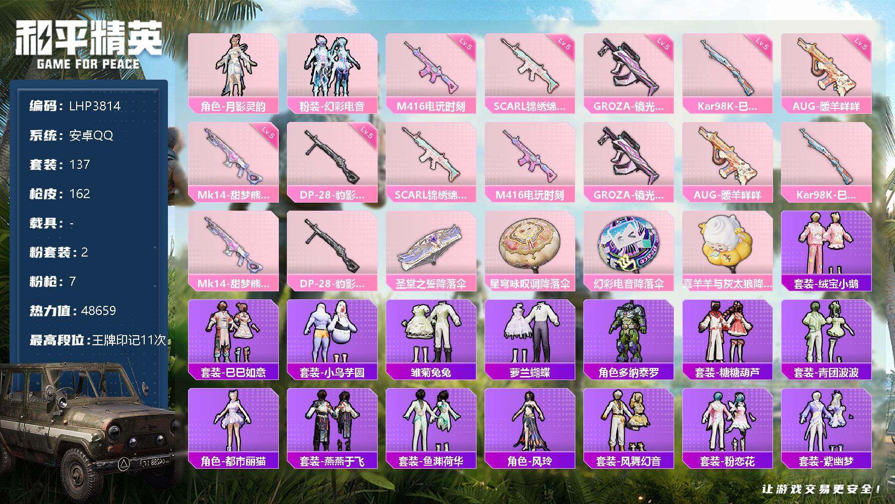 [13131554]【暑期末清货/特价急出/永久包赔】:安卓 手Q-2粉装-7特效枪-4.8w热力值-11印记-137套装-162枪皮【特效枪等级】:SCAR-L-锦绣绵绵(五级),M416-电玩时刻(五级),GROZA-镜光银凌(五级),AUG-暖羊咩咩(五级),Kar98K-巳巳如意(五级),Mk14-甜梦熊击(五级),DP-28-豹影疾电(五级)【优质套装】:角色-月影灵韵,粉装-幻彩电音