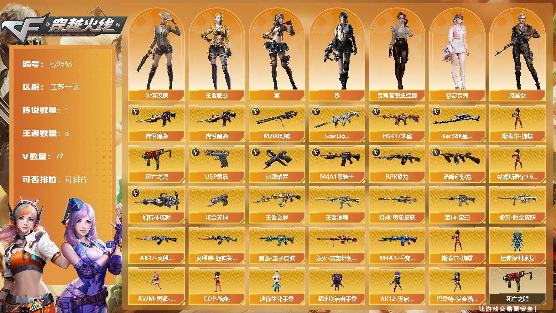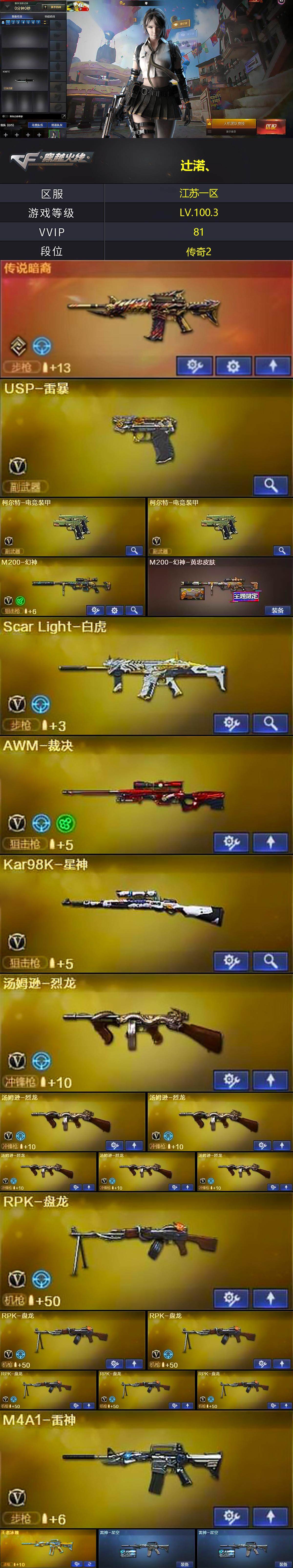 [13787803]江苏一区-79V-6王者-1炫金 【传说武器】:传说暗裔 【热门武器】:传说暗裔,Scar Light-白虎,HK417-朱雀,M200-幻神,死亡之眼,Kar98K-星神,M4A1-黑骑士,汤姆逊-烈龙*6,RPK-盘龙*6,加特林-炼狱,斯泰尔-蝴蝶,USP-雷暴,沙鹰-修罗*2 【王者炫金武器】:王者冰魄,王者之翼,炫金天神 【皮肤】:M200-幻神-黄忠皮肤,雷神-星空*2,AK47-火麒麟-传奇EVEN,火麒麟-战神关羽,毁灭耀金皮肤,毁灭-英雄计划 皮肤,M4A1-千变-孔明皮肤,黑龙-墨子皮肤 【角色】:零,葵,沙漠玫瑰,王者-魅影,初恋灵狐,风暴女,嘉年华灵狐,灵狐者-X,灵狐者-职业经理 【人偶武器】:AK12-天启-骁智金戈,斯泰尔-蝴蝶,AWM-灵狐-15周年嘉年华,COP-旗袍,迷你深渊冰龙,迷你生化手雷*2,深渊终结者手雷,巴雷特-赏金猎人 【暴走生化】:死亡之眼,超级对讲机 【英雄级武器】:AK47-火麒麟,M4A1-黑龙,M4A1-雷神,M4A1-黑骑士,AN94-超新星,AK47-黑鲨,M4A1-龙血*3,HK417-朱雀,Scar Light-白虎,王者之心-觉醒版,王者之势-觉醒版,AK-47-猩红传说,Barrett-毁灭,AWM-裁决,M200-幻神,Barrett-朱雀,Kar98K-星神,Barrett-电竞装甲,RPK-盘龙*6,加特林-炼狱,汤姆逊-烈龙*6,沙鹰-修罗*2,沙鹰-天神,USP-雷暴,柯尔特-电竞装甲*2,屠龙,龙啸*3,擎天,麒麟刺,尼泊尔-电竞装甲,斩神刀-雷暴,王者之击-觉醒版,高爆手雷-雷暴*3,闪光弹-雷暴*3,烟雾弹-雷暴*3 【道具】:茸茸松狮背包,EDG炫彩背包,圣拳猎手-炽雪,女皇终结者-魔龙之吻,黄金生化钩,灵魂忍者,变异宝贝,妖姬,迷雾幽灵,夺命之镰,防化服,金色流光-枪王排位*2,星辰流光-枪王排位,枪王排位29赛季金色流光,防弹头盔*2,防弹衣*2,C4工具钳*2,手雷包*2 【特殊枪械】:蝴蝶斯泰尔+6烈龙,1白虎,1黑骑士,6烈龙,6盘龙,1炼狱,1蝴蝶斯泰尔