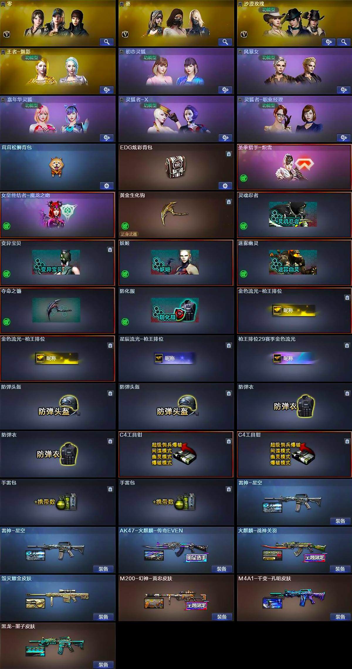 【道具】:茸茸松狮背包,EDG炫彩背包,圣拳猎手-炽雪,女皇终结者-魔龙之吻,黄金生化钩,灵魂忍者,变异宝贝,妖姬,迷雾幽灵,夺命之镰,防化服,金色流光-枪王排位*2,星辰流光-枪王排位,枪王排位29赛季金色流光,防弹头盔*2,防弹衣*2,C4工具钳*2,手雷包*2
