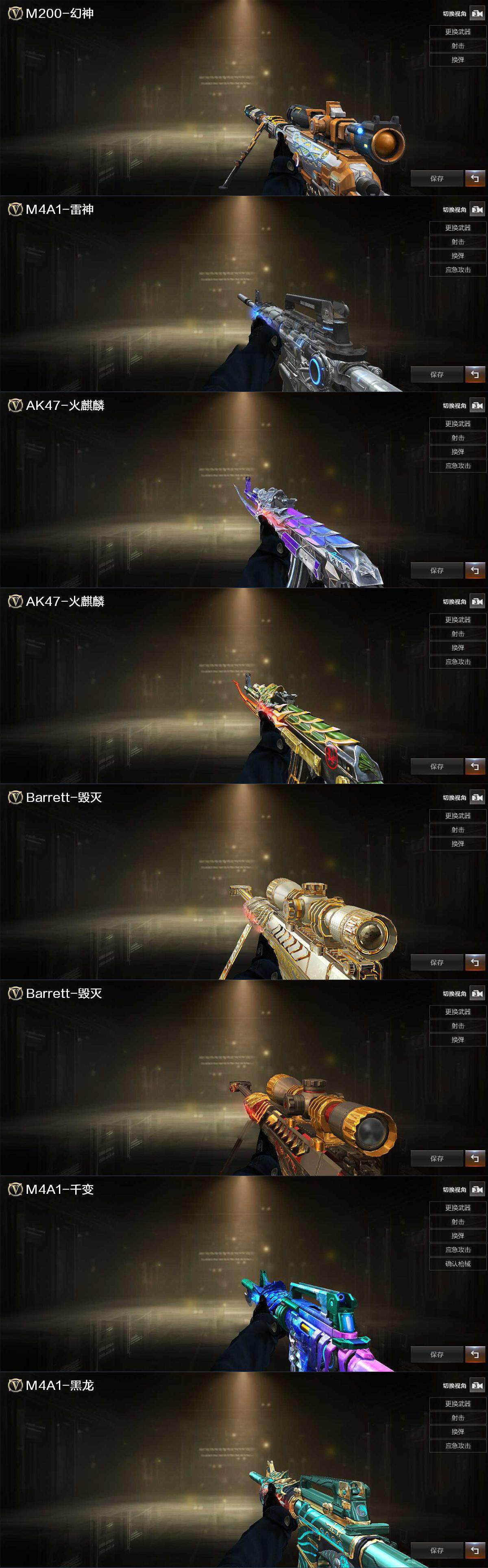 【皮肤】:M200-幻神-黄忠皮肤,雷神-星空*2,AK47-火麒麟-传奇EVEN,火麒麟-战神关羽,毁灭耀金皮肤,毁灭-英雄计划 皮肤,M4A1-千变-孔明皮肤,黑龙-墨子皮肤