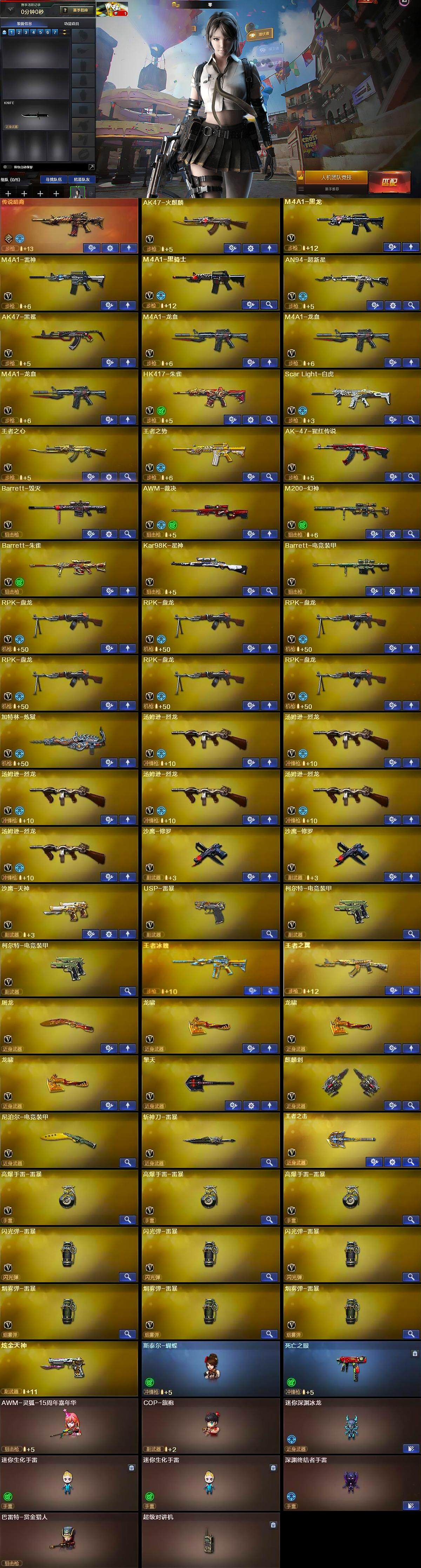 【英雄级武器】:AK47-火麒麟,M4A1-黑龙,M4A1-雷神,M4A1-黑骑士,AN94-超新星,AK47-黑鲨,M4A1-龙血*3,HK417-朱雀,Scar Light-白虎,王者之心-觉醒版,王者之势-觉醒版,AK-47-猩红传说,Barrett-毁灭,AWM-裁决,M200-幻神,Barrett-朱雀,Kar98K-星神,Barrett-电竞装甲,RPK-盘龙*6,加特林-炼狱,汤姆逊-烈龙*6,沙鹰-修罗*2,沙鹰-天神,USP-雷暴,柯尔特-电竞装甲*2,屠龙,龙啸*3,擎天,麒麟刺,尼泊尔-电竞装甲,斩神刀-雷暴,王者之击-觉醒版,高爆手雷-雷暴*3,闪光弹-雷暴*3,烟雾弹-雷暴*3