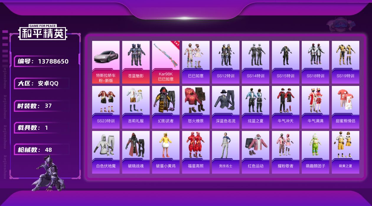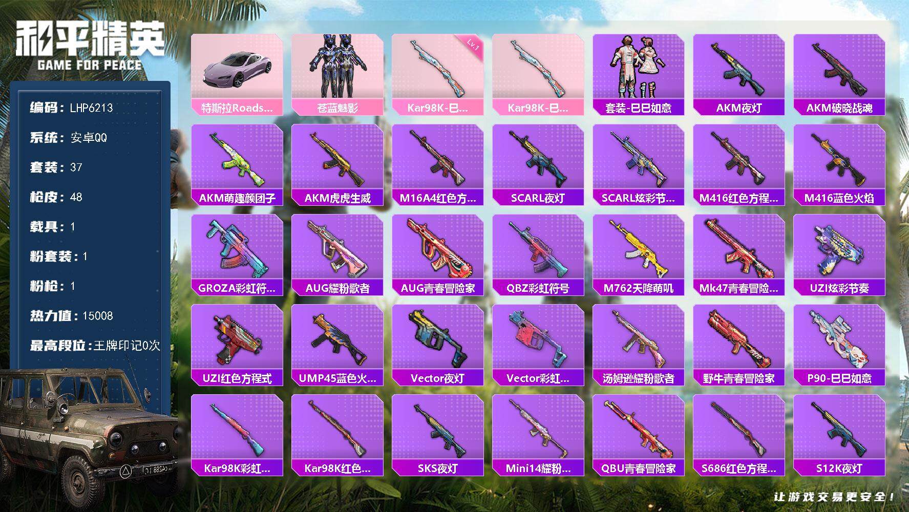 [13788650]可二次【店主推荐捡漏号!可直接换绑】 安卓 手Q-1粉装-1特效枪-1载具-1.5w热力值-2王牌印记-37套装-48枪皮【粉色载具】:特斯拉Roadster(沁心粉)【粉色套装】:粉装-苍蓝魅影【粉色枪皮等级】:Kar98K-巳巳如意(一级)