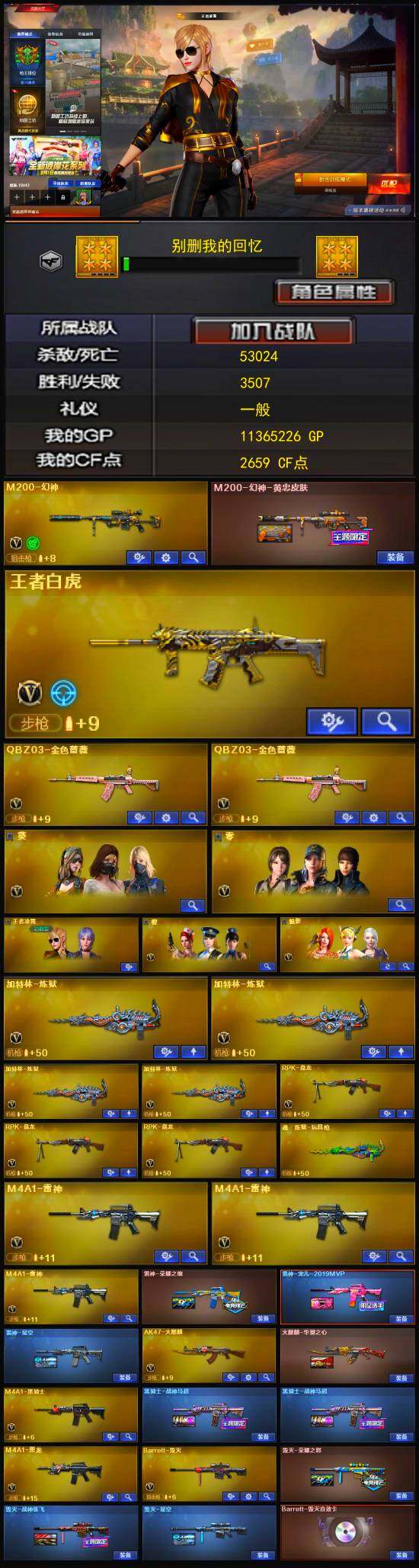 【热门武器】:QBZ03-金色蔷薇*2,M200-幻神,M4A1-黑骑士,RPK-盘龙*3,加特林-炼狱*4,沙鹰-修罗*11