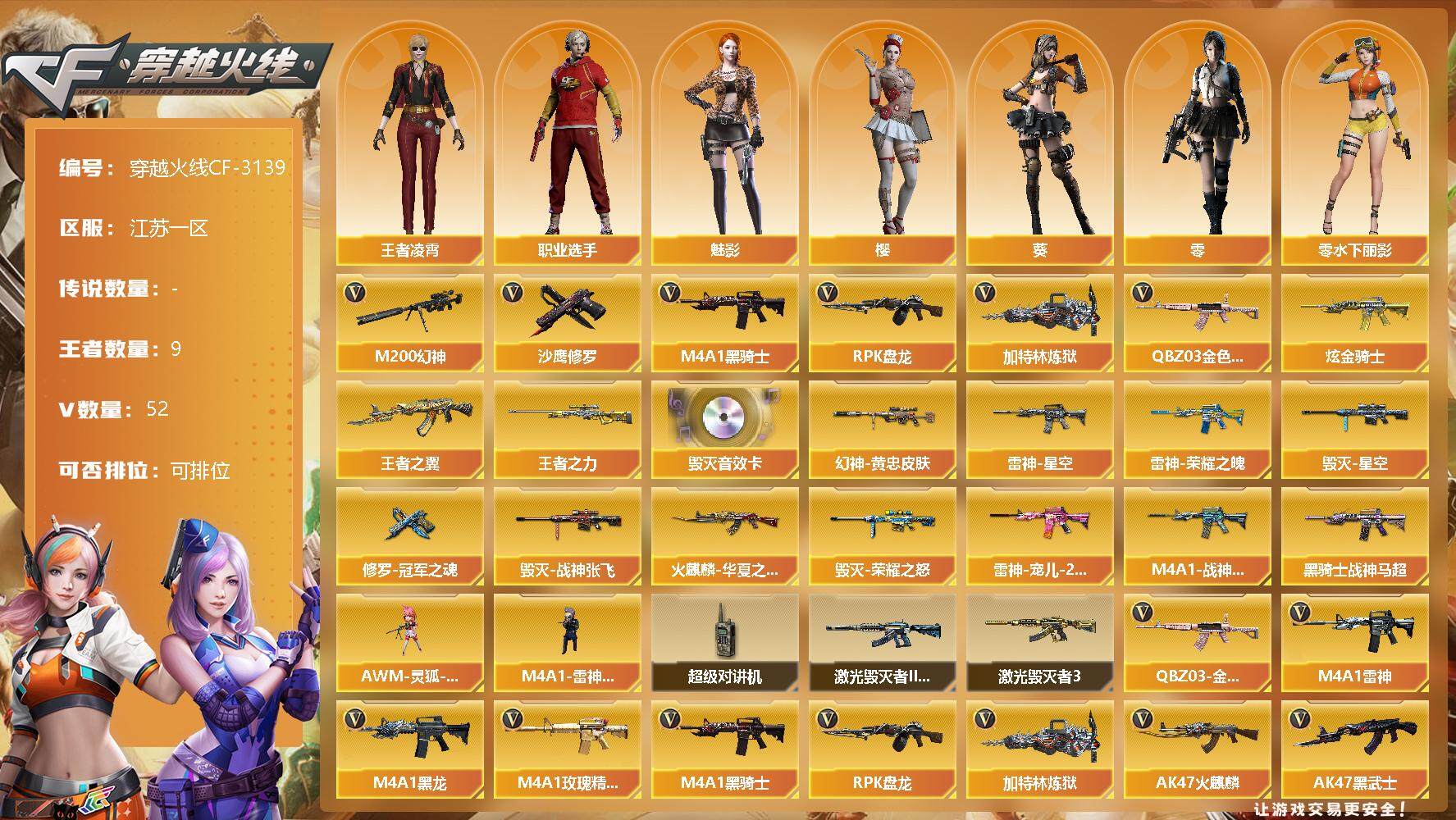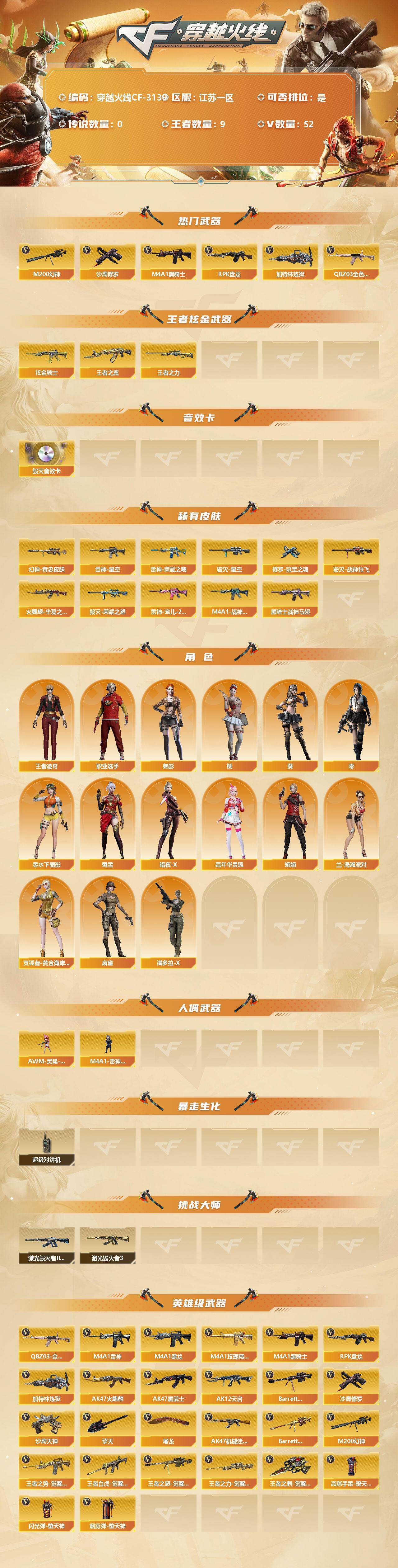 [13143944]江苏一区-52V-9王者-1炫金 【热门武器】:QBZ03-金色蔷薇*2,M200-幻神,M4A1-黑骑士,RPK-盘龙*3,加特林-炼狱*4,沙鹰-修罗*11 【王者炫金武器】:王者之翼,王者之力*2,炫金骑士 【音效卡】:Barrett-毁灭音效卡 【皮肤】:M200-幻神-黄忠皮肤,雷神-荣耀之魄,雷神-星空,M4A1-战神赵云,雷神-宠儿-2019MVP,火麒麟-华夏之心,毁灭-荣耀之怒,毁灭-星空,毁灭-战神张飞,黑骑士-战神马超*2,修罗-冠军之魂*2 【角色】:零,葵,樱,魅影,王者凌霄,暗夜-X,嘉年华灵狐,娟娟,兰-海滩派对,零-水下丽影,灵狐者-黄金海岸,麻雀,潘多拉-X,蜀雪,职业选手 【人偶武器】:M4A1-雷神-精英刀锋,AWM-灵狐-15周年嘉年华 【暴走生化】:超级对讲机 【挑战大师】:激光毁灭者III-白马银枪,激光毁灭者III 【英雄级武器】:AK47-火麒麟,M4A1-黑龙,M4A1-雷神*3,M4A1-黑骑士,AK47-黑武士,AK12-天启,AK47-机械迷城,M4A1-玫瑰精灵,QBZ03-金色蔷薇*2,王者之势-觉醒版,王者白虎-觉醒版,Barrett-毁灭,M200-幻神,Barrett-朱雀,王者之怒-觉醒版,王者之力-觉醒版,RPK-盘龙*3,加特林-炼狱*4,沙鹰-修罗*11,沙鹰-天神,屠龙*5,擎天*6,王者之刺-觉醒版,高爆手雷-堕天神,闪光弹-堕天神,烟雾弹-堕天神 【特殊枪械】:1黑骑士,3盘龙,4炼狱