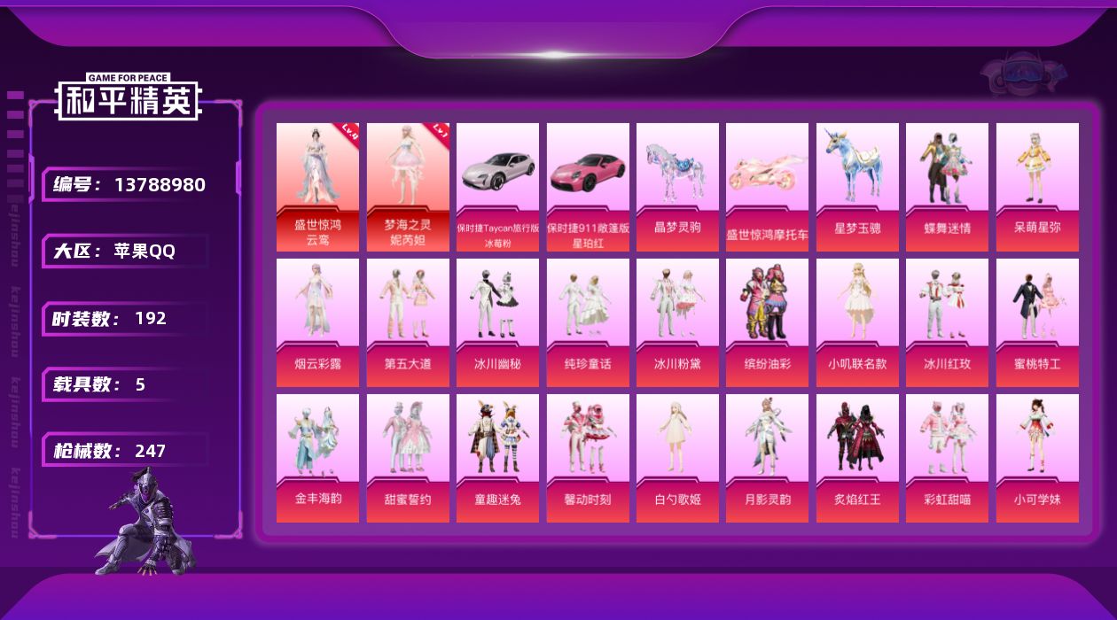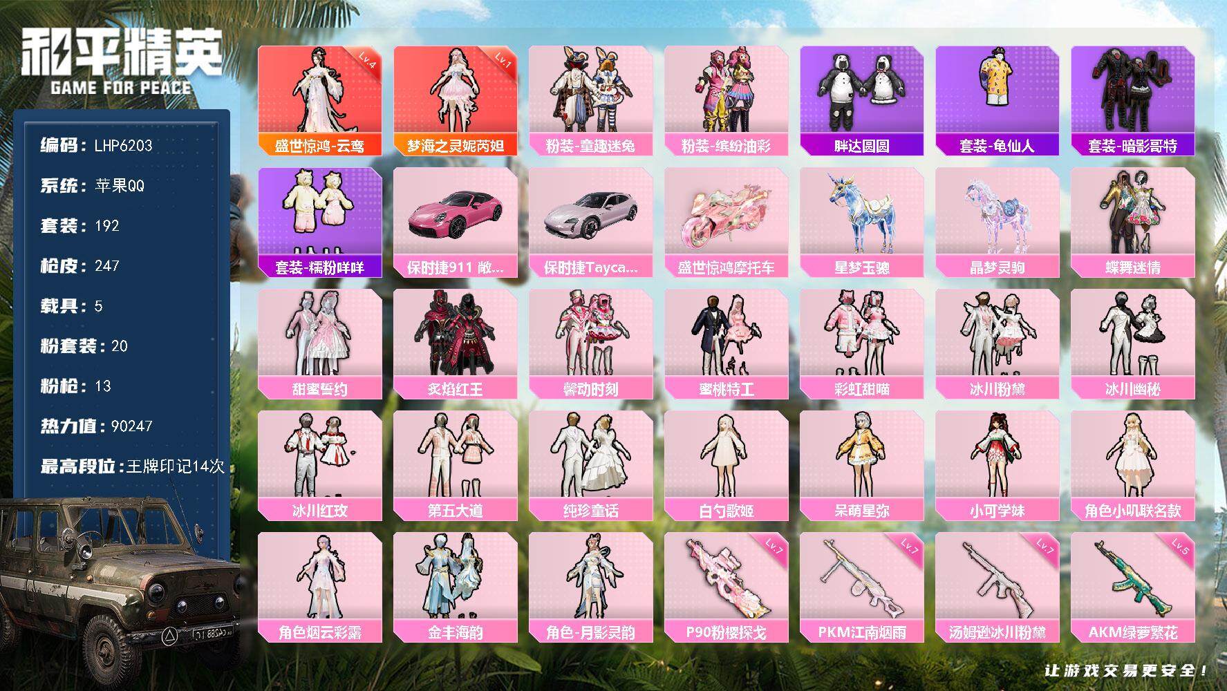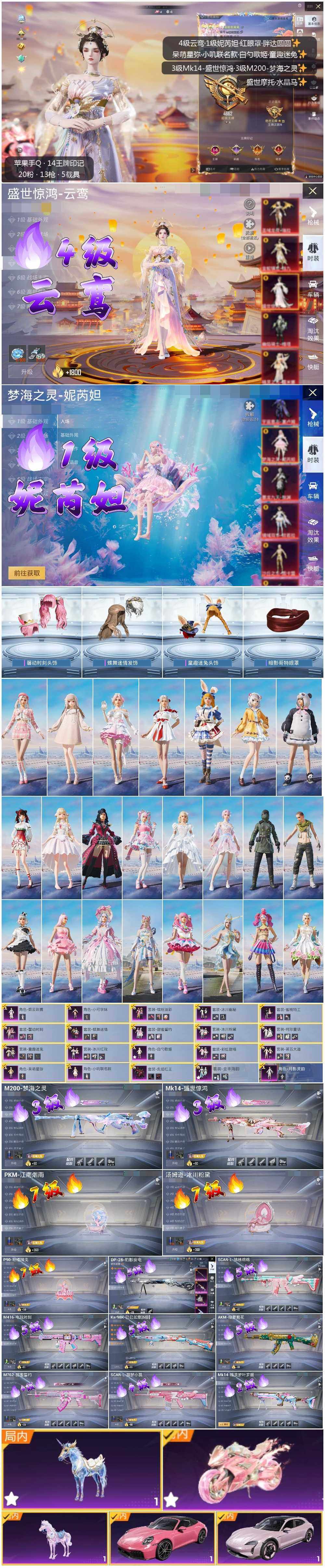 [13788980]可二次【店主推荐捡漏号!可直接换绑】/素材身法号/绝世印记4/盛世惊鸿-云鸾(四级) 苹果 手Q-2神装-20粉装-13特效枪-5载具-6粉色飞行器-9w热力值-14王牌印记-192套装-247枪皮【红色神装等级】:盛世惊鸿-云鸾(四级),梦海之灵-妮芮妲(一级)【热门品类】:粉装-童趣迷兔,粉装-缤纷油彩,套装-胖达圆圆,套装-龟仙人,套装-暗影哥特,套装-糯粉咩咩【粉色载具】:保时捷911 敞篷版(星珀红),保时捷Taycan 旅行版(冰莓粉),盛世惊鸿摩托车,星梦玉骢,晶梦灵驹【粉色套装】:粉装-蝶舞迷情,粉装-缤纷油彩,粉装-甜蜜誓约,粉装-童趣迷兔,粉装-炙焰红王,粉装-馨动时刻,粉装-蜜桃特工,粉装-彩虹甜喵,粉装-冰川粉黛,粉装-冰川幽秘,粉装-冰川红玫,粉装-第五大道,粉装-纯珍童话,角色-白勺歌姬,角色-呆萌星弥,角色-小可学妹,角色-小叽联名款,角色-烟云彩露,粉装-金丰海韵,角色-月影灵韵【粉色枪皮等级】:AKM-绿萝繁花(五级),SCAR-L-甜梦小狐(四级),SCAR-L-锦绣绵绵(五级),M416-电玩时刻(五级),M762-甜蜜誓约(四级),汤姆逊-冰川粉黛(七级),P90-粉樱探戈(七级),Kar98K-巳巳如意(五级),Mk14-精灵梦叶罗丽(二级),Mk14-盛世惊鸿(三级),M200-梦海之灵(三级),DP-28-豹影疾电(五级),PKM-江南烟雨(七级)【粉色飞行器】:酣梦熊熊飞行器,春暖花开飞行器,甜蜜誓约飞行器,萌物绒绒飞行器,幻海精灵飞行器,凤舞九天飞行器