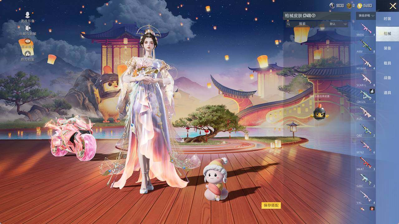 AKM-绿萝繁花,SCAR-L-甜梦小狐,M416-电玩时刻,M762-甜蜜誓约,汤姆逊-冰川粉黛,P90-粉樱探戈,Kar98K-巳巳如意,Mk14-精灵梦叶罗丽,Mk14-盛世惊鸿,M200-梦海之灵,PKM-江南烟雨
