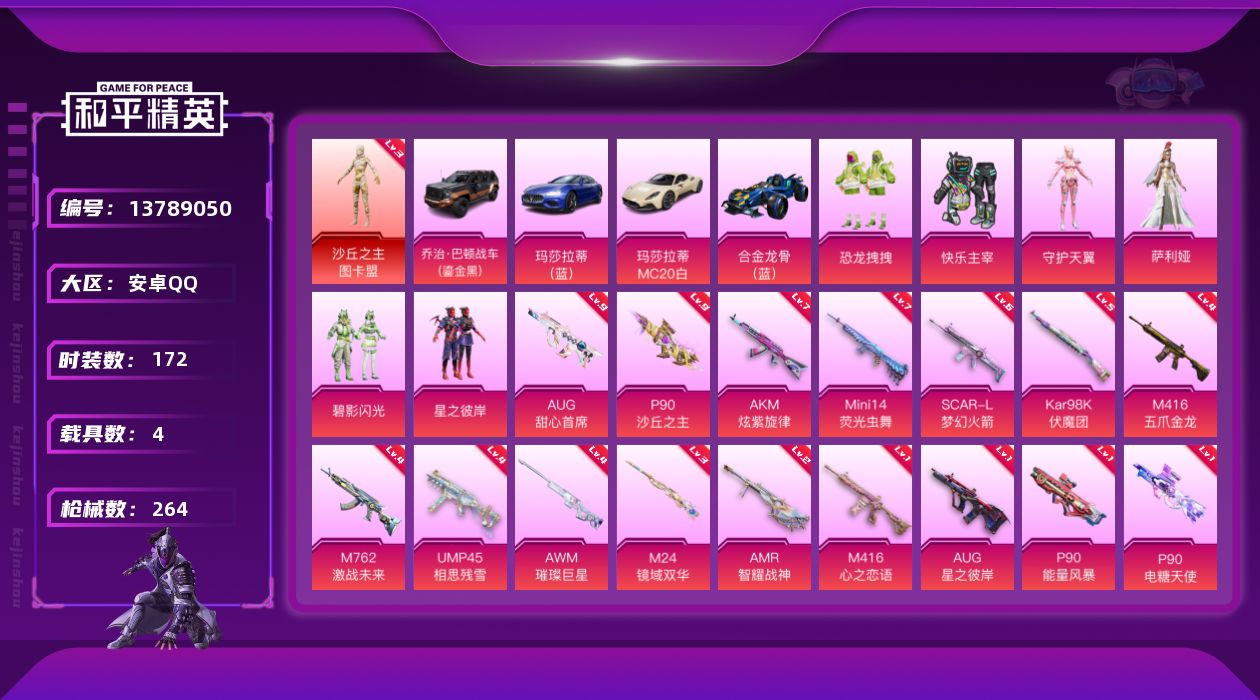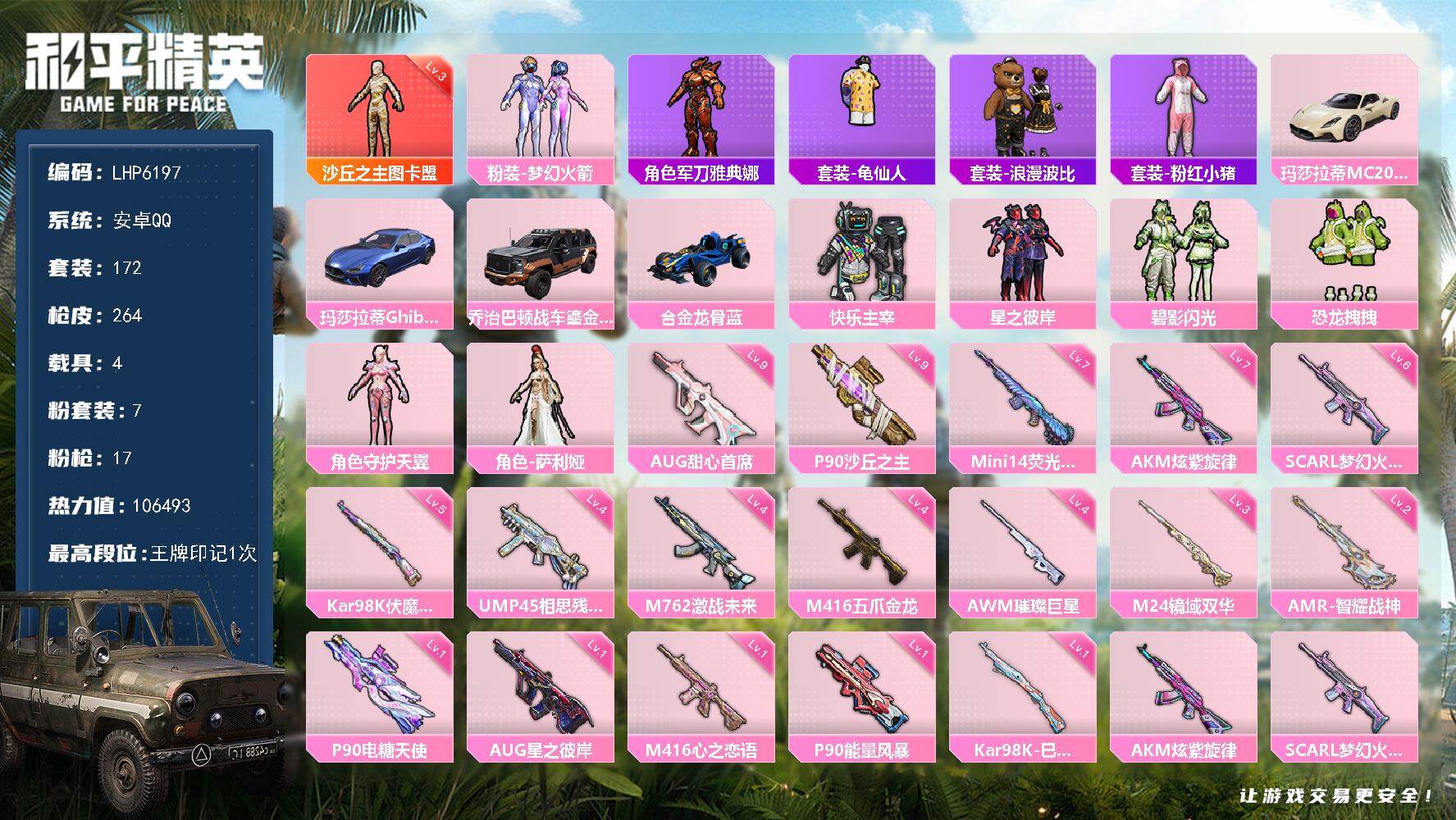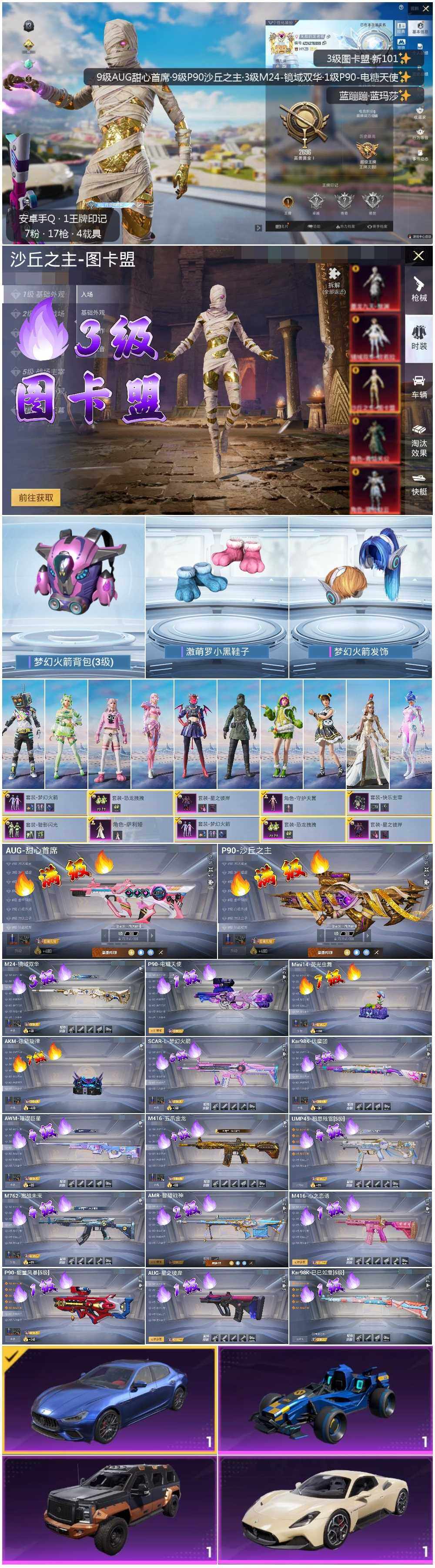 [13789050]可二次【店主推荐捡漏号!可直接换绑】/素材身法号/AUG-甜心首席(九级)/P90-沙丘之主(九级) 安卓 手Q-1神装-7粉装-17特效枪-4载具-7粉色飞行器-10.6w热力值-1王牌印记-172套装-264枪皮【红色神装等级】:沙丘之主-图卡盟(三级)【热门品类】:粉装-梦幻火箭,角色-军刀雅典娜,套装-龟仙人,套装-浪漫波比,套装-粉红小猪【粉色载具】:玛莎拉蒂MC20(星石白),玛莎拉蒂Ghibli(蓝),乔治巴顿战车(鎏金黑),合金龙骨(蓝)【粉色套装】:粉装-快乐主宰,粉装-梦幻火箭,粉装-星之彼岸,粉装-碧影闪光,粉装-恐龙拽拽,角色-守护天翼,角色-萨利娅【粉色枪皮等级】:AKM-炫紫旋律(七级),SCAR-L-梦幻火箭(六级),M416-五爪金龙(四级),M416-心之恋语(一级),AUG-星之彼岸(一级),AUG-甜心首席(九级),M762-激战未来(四级),UMP45-相思残雪(四级),P90-能量风暴(一级),P90-沙丘之主(九级),P90-电糖天使(一级),Kar98K-伏魔团(五级),Kar98K-巳巳如意(一级),M24-镜域双华(三级),AWM-璀璨巨星(四级),Mini14-荧光虫舞(七级),AMR-智耀战神(二级)【粉色飞行器】:梦幻火箭飞行器,炫紫旋律飞行器,神秘黑猫飞行器,夏日绵绵冰飞行器,星之彼岸飞行器,沙丘之主天马,镜域双华-灵镜之阶