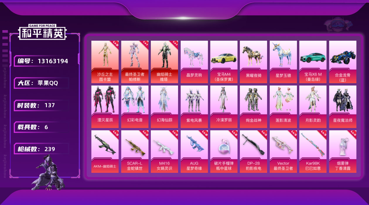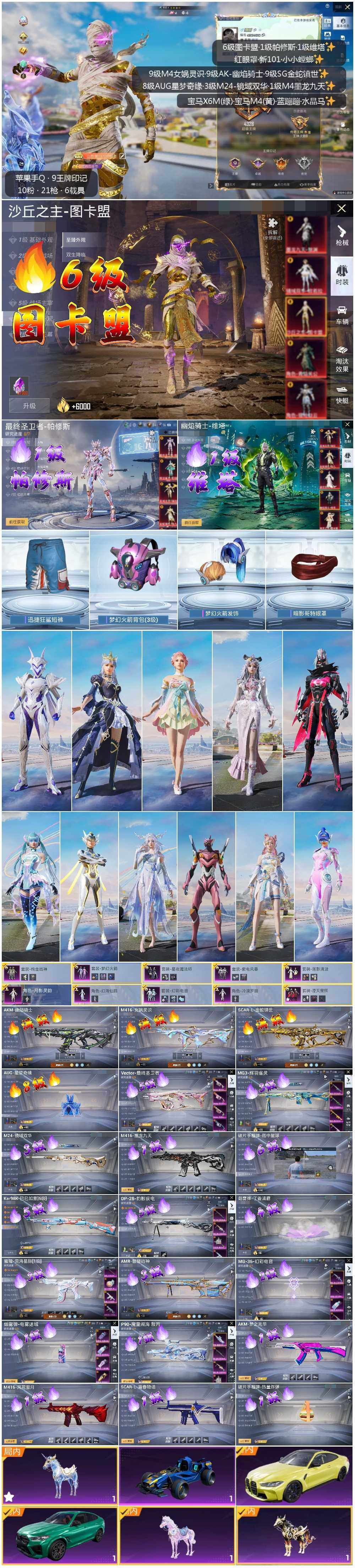 [13163194]素材身法号/沙丘之主-图卡盟(六级)/M416-女娲灵识(九级)/AKM-幽焰骑士(九级)/SCAR-L-金蛇镇世(九级)/璀璨碎片776 苹果 手Q-3神装-10粉装-21特效枪-6载具-14粉色飞行器-11.3w热力值-9王牌印记-137套装-239枪皮【红色神装等级】:最终圣卫者-帕修斯(一级),幽焰骑士-维塔(一级),沙丘之主-图卡盟(六级)【热门品类】:粉装-梦幻火箭,套装-暗影哥特,角色-8号机【粉色载具】:宝马M4(圣保罗黄),宝马X6 M(曼岛绿),合金龙骨(蓝),星梦玉骢,晶梦灵驹,黑曜夜骑【粉色套装】:粉装-梦幻火箭,粉装-绚金战神,粉装-紫电风暴,粉装-星夜魔法师,粉装-莲影清波,角色-月影灵韵,角色-幻海仙踪,粉装-湮灭星辰,粉装-幻彩电音,角色-冷漠罗丽【粉色枪皮等级】:AKM-梦之光华(一级),AKM-幽焰骑士(九级),SCAR-L-青春物语(一级),SCAR-L-金蛇镇世(九级),M416-风花雪月(一级),M416-墨龙九天(一级),M416-女娲灵识(九级),AUG-星梦奇缘(八级),蜜獾-荧海星豚(三级),Vector-最终圣卫者(五级),P90-魔童闹海 敖丙(一级),Kar98K-巳巳如意(五级),M24-镜域双华(三级),AMR-智耀战神(三级),DP-28-豹影疾电(五级),MG3-辉羽雀灵(三级),MG-36-幻彩电音(二级),烟雾弹-丁香清露(四级),烟雾弹-电雾迷城(一级),破片手榴弹-热量炸弹(一级),破片手榴弹-瓶中星球(六级)【粉色飞行器】:酣梦熊熊飞行器,绿意幻情飞行器,沙丘之主天马,龙翔九天飞行器,幽焰列车飞行器,凤舞九天飞行器,万象金身飞行器,圣域金龙飞行器,圣辉之星飞行器,雀灵庇佑飞行器,灵猫魔法师飞行器,灵珠游龙飞行器