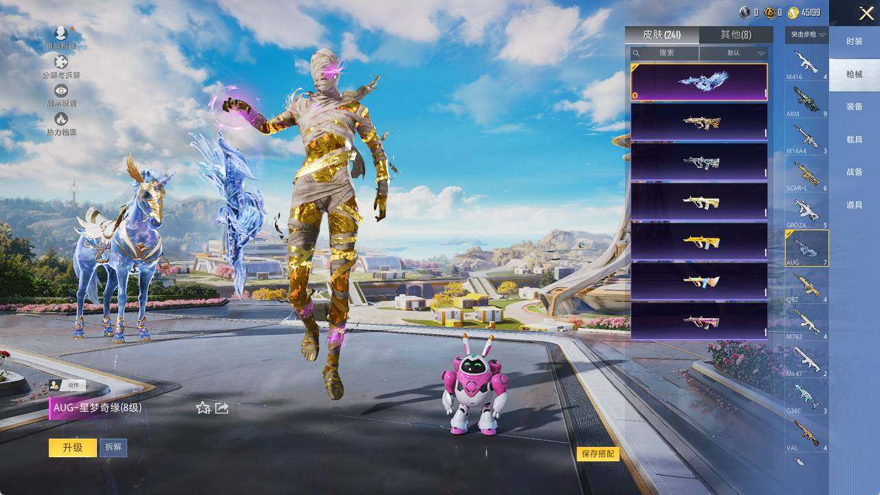 AKM-梦之光华,AKM-幽焰骑士,SCAR-L-青春物语,SCAR-L-金蛇镇世,M416-风花雪月,M416-墨龙九天,M416-女娲灵识,AUG-星梦奇缘,Kar98K-巳巳如意,M24-镜域双华,烟雾弹-丁香清露,破片手榴弹-热量炸弹