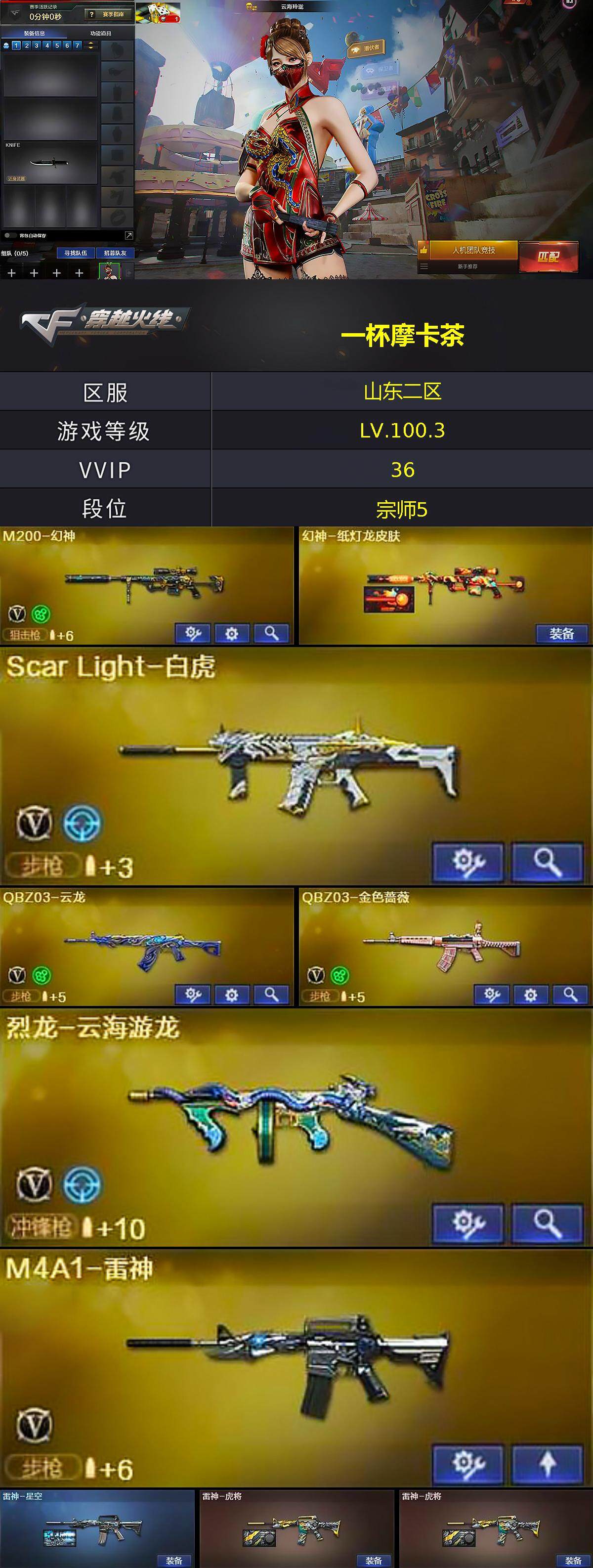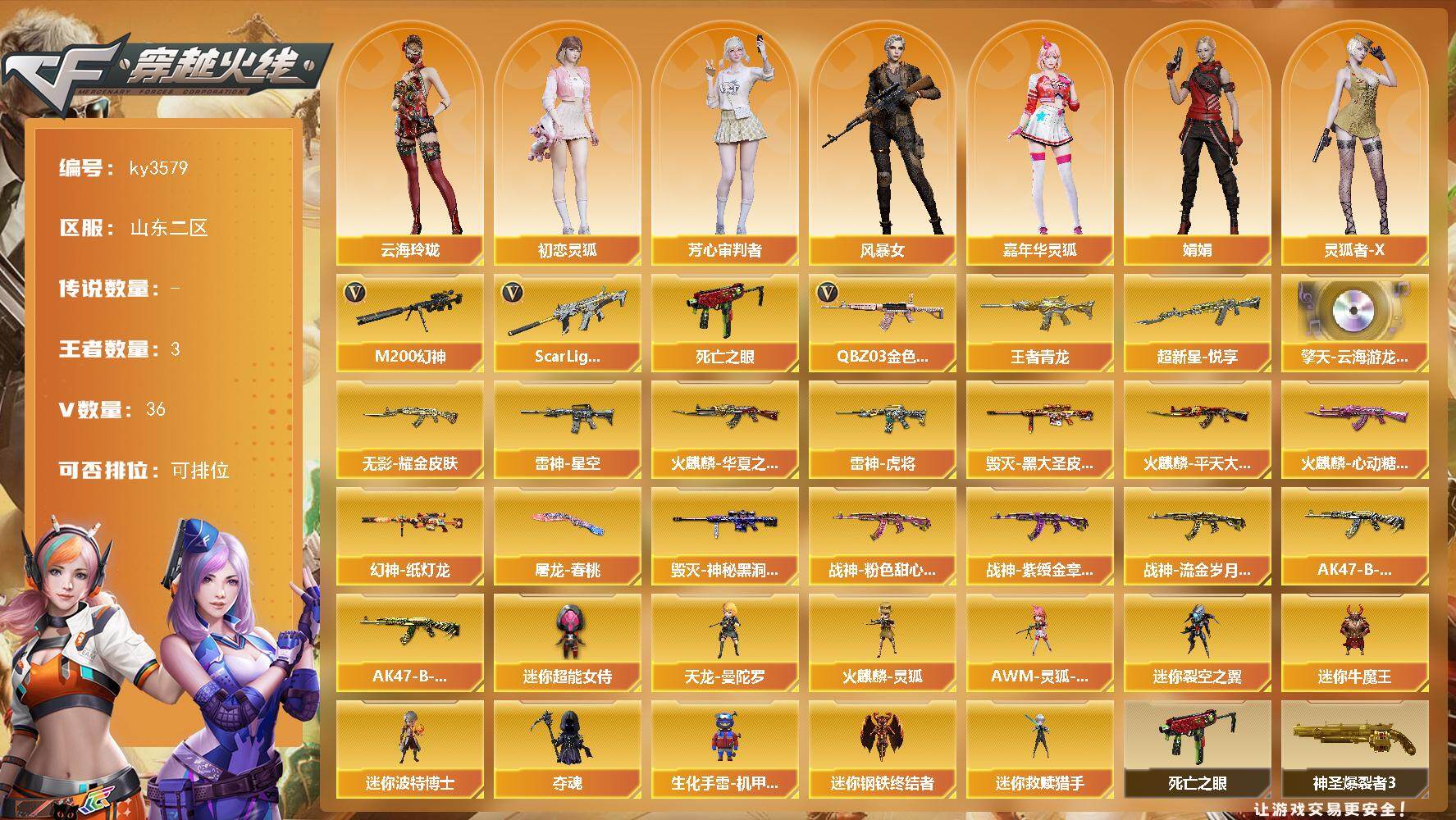 [13819150]山东二区-36V-3王者-0炫金 【热门武器】:QBZ03-金色蔷薇,Scar Light-白虎,M200-幻神,死亡之眼 【王者炫金武器】:超新星-悦享,王者青龙 【音效卡】:擎天-云海游龙音效卡 【皮肤】:幻神-纸灯龙皮肤,雷神-星空,雷神-虎将*2,火麒麟-华夏之心,火麒麟-平天大圣*2,火麒麟-心动糖果,毁灭-黑大圣皮肤,毁灭-神秘黑洞皮肤,无影耀金皮肤,战神-粉色甜心皮肤*2,战神-紫绶金章皮肤*2,战神-流金岁月皮肤*3,AK47-B-常胜将军-刘备,AK47-B-常胜将军-孙权,屠龙-春桃 皮肤 【角色】:云海玲珑,初恋灵狐,芳心审判者,风暴女,嘉年华灵狐,娟娟,灵狐者-X,灵狐者-七夕宝贝,龙儿-小淘气,潘多拉-X,潘多拉-甜心教官,潜龙队-X,邱刚敖,蛇姬,斯沃特-X,樱-战斗天使 【人偶武器】:天龙-曼陀罗,火麒麟-灵狐,迷你钢铁终结者,迷你救赎猎手,AWM-灵狐-15周年嘉年华,迷你裂空之翼*4,迷你牛魔王,迷你波特博士,夺魂,生化手雷-机甲核心,迷你超能女侍 【暴走生化】:死亡之眼 【挑战大师】:神圣爆裂者III,冰龙粉碎者-白马银枪*4,激光毁灭者III-白马银枪,VEPR-12-金魔*2,激光毁灭者III,机甲撕裂者III,神圣爆裂者-末日III,阐释者III*2 【英雄级武器】:AK47-火麒麟,M4A1-雷神,Scar Light-白虎,无影-神兵利器,QBZ03-云龙,黑武士-锦绣游龙,QBZ03-金色蔷薇,黑骑士-海王,AK47-B-常胜将军,Barrett-毁灭,M200-幻神,炼狱-悦蓝-觉醒版,烈龙-云海游龙,修罗-云海游龙,屠龙,麒麟刺,幻灵之锋,擎天-云海游龙,高爆手雷-幻灵*6,手雷-云海游龙,闪光弹-幻灵*3,烟雾弹-幻灵*5,M4A1-赤狱骑士 【道具】:云海游龙炫彩背包,亚洲杯纪念炫彩背包,炫彩背包,背包-葫芦兄弟,超级背包,黄金曼提柯尔的背包,终极猎手-秦魂将军,女皇终结者-魔龙之吻,救世主-黑桃战神,绿色巨人,灵魂忍者,变异宝贝,迷雾幽灵,夺命之镰,防化服*3,金色流光-枪王排位*2,星辰流光-枪王排位,流光-再燃火线,枪王排位28赛季金色流光,枪王排位29赛季金色流光,电玩兔兔表情,云海游龙表情,防弹头盔*3,防弹衣*3,C4工具钳*3,手雷包*3 【特殊枪械】:1白虎