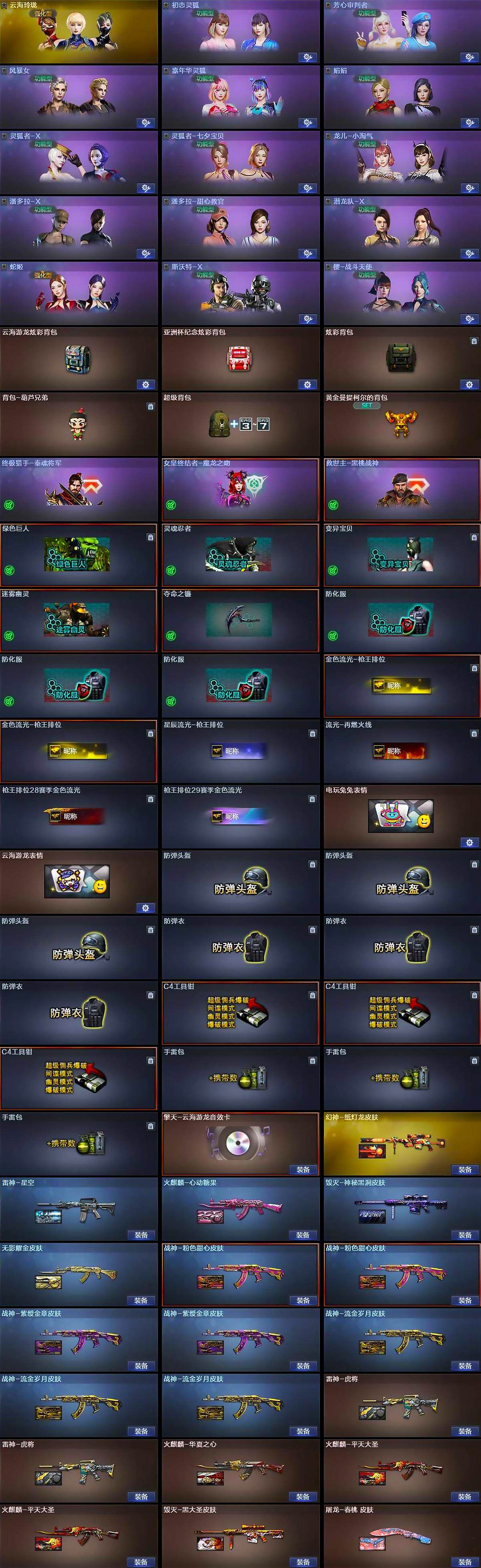【道具】:云海游龙炫彩背包,亚洲杯纪念炫彩背包,炫彩背包,背包-葫芦兄弟,超级背包,黄金曼提柯尔的背包,终极猎手-秦魂将军,女皇终结者-魔龙之吻,救世主-黑桃战神,绿色巨人,灵魂忍者,变异宝贝,迷雾幽灵,夺命之镰,防化服*3,金色流光-枪王排位*2,星辰流光-枪王排位,流光-再燃火线,枪王排位28赛季金色流光,枪王排位29赛季金色流光,电玩兔兔表情,云海游龙表情,防弹头盔*3,防弹衣*3,C4工具钳*3,手雷包*3