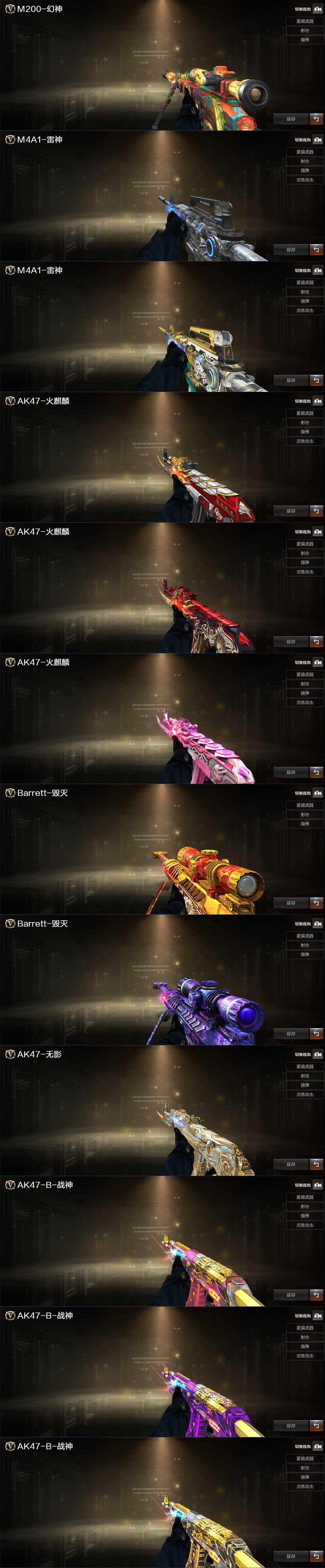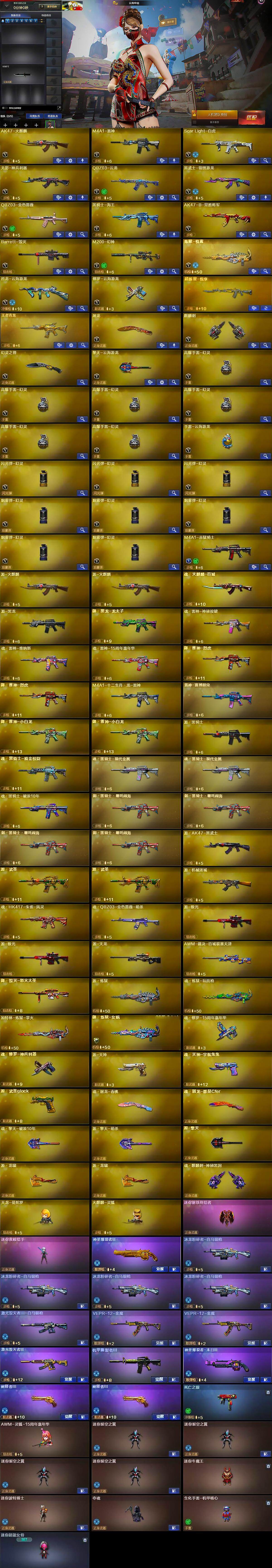 【英雄级武器】:AK47-火麒麟,M4A1-雷神,Scar Light-白虎,无影-神兵利器,QBZ03-云龙,黑武士-锦绣游龙,QBZ03-金色蔷薇,黑骑士-海王,AK47-B-常胜将军,Barrett-毁灭,M200-幻神,炼狱-悦蓝-觉醒版,烈龙-云海游龙,修罗-云海游龙,屠龙,麒麟刺,幻灵之锋,擎天-云海游龙,高爆手雷-幻灵*6,手雷-云海游龙,闪光弹-幻灵*3,烟雾弹-幻灵*5,M4A1-赤狱骑士