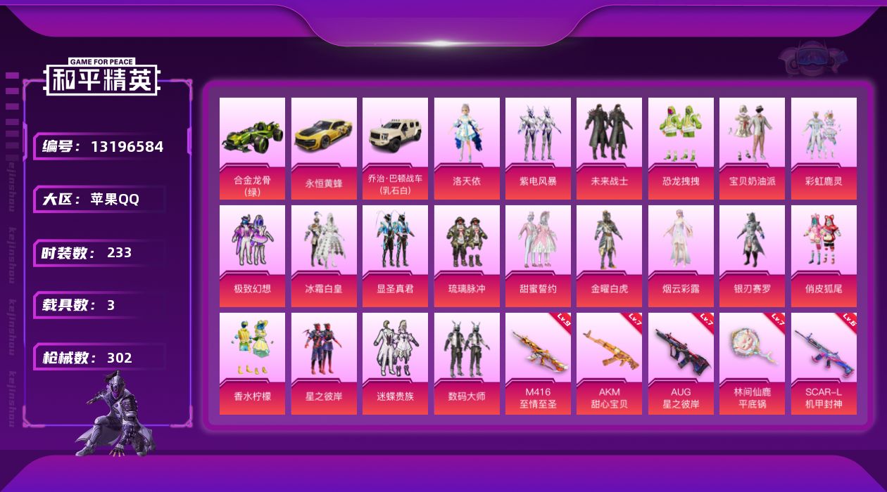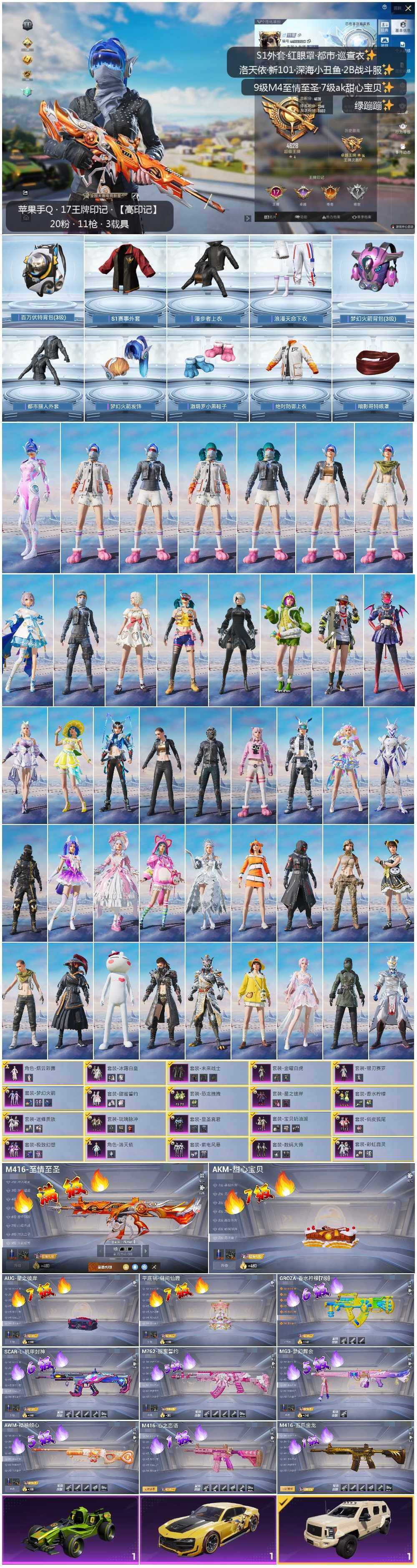 [13196584]素材身法号/M416-至情至圣(九级) 苹果 手Q-20粉装-11特效枪-3载具-6粉色飞行器-11.2w热力值-17王牌印记-233套装-302枪皮【热门品类】:粉装-梦幻火箭,绝对防御上衣,套装-浪漫天命,套装-都市猎人,套装-深海小丑鱼,套装-小丑鱼,套装-奇异狩猎者,套装-金羽特工,套装-忍者信条,套装-星河浪客,套装-暗夜行者,套装-浪客战士,套装-动感兔斯基人偶服,角色-2B战斗服款,套装-龟仙人,套装-潮萌小黄鸭,套装-暗影哥特,套装-浪漫波比,套装-粉红小猪,熔岩游骑兵面罩,撬棍-龙胆亮银枪【粉色载具】:乔治巴顿战车(乳石白),永恒黄蜂,合金龙骨(绿)【粉色套装】:粉装-数码大师,粉装-未来战士,粉装-宝贝奶油派,粉装-金曜白虎,粉装-梦幻火箭,粉装-琉璃脉冲,粉装-甜蜜誓约,粉装-极致幻想,粉装-迷蝶贵族,粉装-俏皮狐尾,粉装-银刃赛罗,粉装-冰霜白皇,粉装-香水柠檬,粉装-星之彼岸,粉装-显圣真君,粉装-彩虹鹿灵,角色-洛天依,粉装-恐龙拽拽,粉装-紫电风暴,角色-烟云彩露【粉色枪皮等级】:AKM-甜心宝贝(七级),SCAR-L-机甲封神(六级),M416-五爪金龙(一级),M416-心之恋语(一级),M416-至情至圣(九级),GROZA-香水柠檬(六级),AUG-星之彼岸(七级),M762-甜蜜誓约(五级),AWM-橘柚倾心(五级),MG3-梦幻舞会(五级),平底锅-林间仙鹿(七级)【粉色飞行器】:梦幻火箭飞行器,心之恋语飞行翼,夏日绵绵冰飞行器,齐天大圣飞行器
