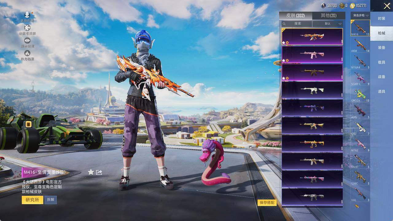 AKM-甜心宝贝,SCAR-L-机甲封神,M416-五爪金龙,M416-心之恋语,M416-至情至圣,GROZA-香水柠檬,AUG-星之彼岸,M762-甜蜜誓约,AWM-橘柚倾心,MG3-梦幻舞会,平底锅-林间仙鹿
